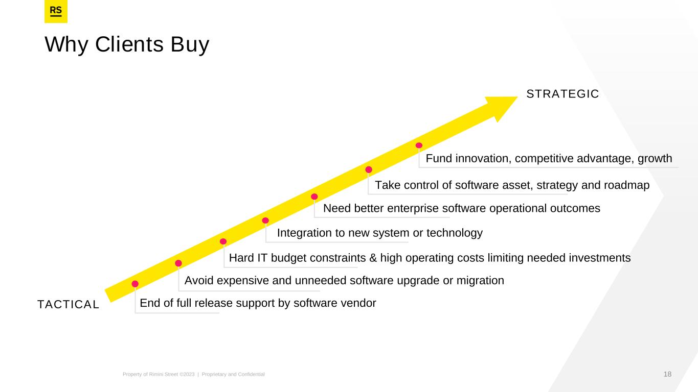 Why Clients Buy Reduce cost of Support and Application Management Services ▪ Lower annual fees ▪ Guarantee service on current releases for at least 15 years ▪ Higher quality service with broader scope Property of Rimini Street ©2023 | Proprietary and Confidential 17 And why they will buy even more Rimini Street solutions in the future Fund and focus on strategic initiatives that enhance competitive advantage and fuel growth ▪ Significant IT operating budget and staff redeployed from upgrades to strategic initiatives Improve ERP operating outcomes ▪ Top engineering talent and experience ▪ Best deliverables, such as TLR updates ▪ Unmatched client satisfaction, averaging 4.9/5.0 ▪ Average response time under 5 minutes for urgent cases