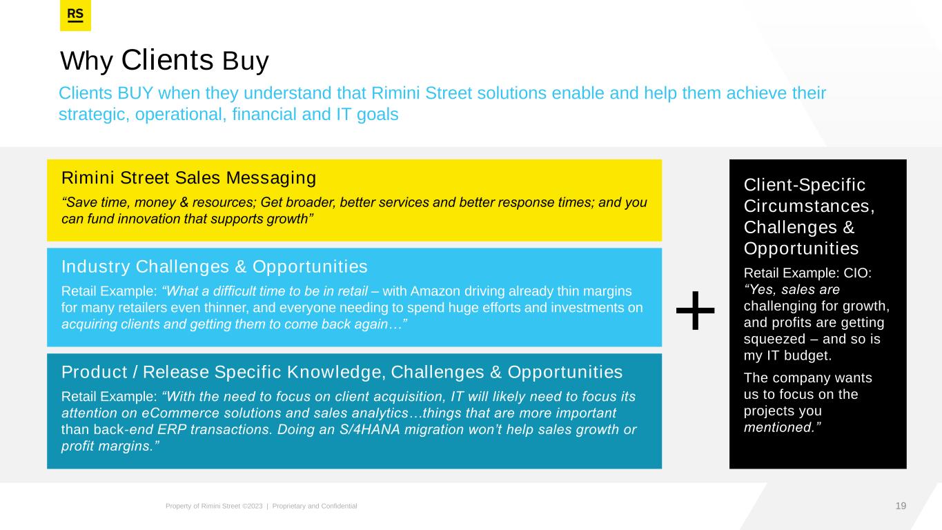 Why Clients Buy Property of Rimini Street ©2023 | Proprietary and Confidential 19 Clients BUY when they understand that Rimini Street solutions enable and help them achieve their strategic, operational, financial and IT goals Rimini Street Sales Messaging “Save time, money & resources; Get broader, better services and better response times; and you can fund innovation that supports growth” Industry Challenges & Opportunities Retail Example: “What a difficult time to be in retail – with Amazon driving already thin margins for many retailers even thinner, and everyone needing to spend huge efforts and investments on acquiring clients and getting them to come back again…” Product / Release Specific Knowledge, Challenges & Opportunities Retail Example: “With the need to focus on client acquisition, IT will likely need to focus its attention on eCommerce solutions and sales analytics…things that are more important than back-end ERP transactions. Doing an S/4HANA migration won’t help sales growth or profit margins.” Client-Specific Circumstances, Challenges & Opportunities Retail Example: CIO: “Yes, sales are challenging for growth, and profits are getting squeezed – and so is my IT budget. The company wants us to focus on the projects you mentioned.” +