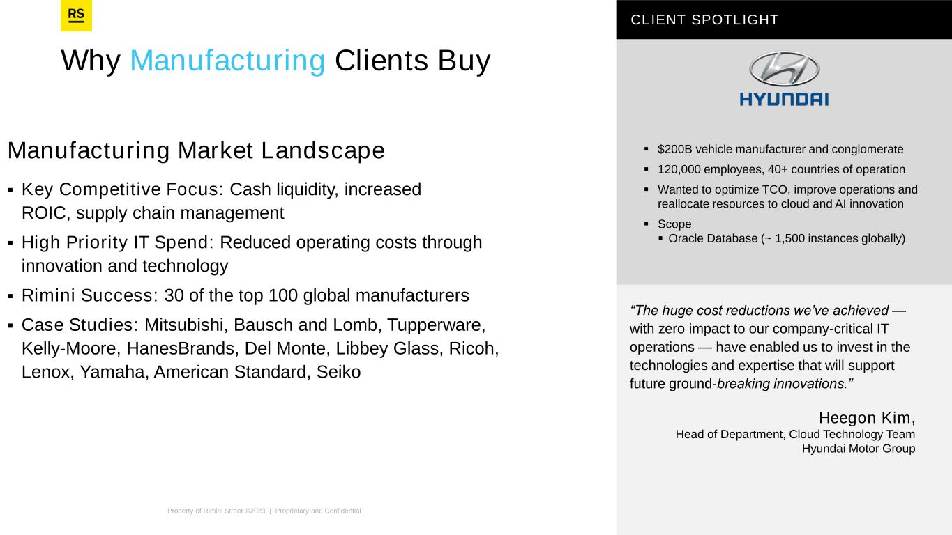 Why Manufacturing Clients Buy Property of Rimini Street ©2023 | Proprietary and Confidential 20 Manufacturing Market Landscape ▪ Key Competitive Focus: Cash liquidity, increased ROIC, supply chain management ▪ High Priority IT Spend: Reduced operating costs through innovation and technology ▪ Rimini Success: 30 of the top 100 global manufacturers ▪ Case Studies: Mitsubishi, Bausch and Lomb, Tupperware, Kelly-Moore, HanesBrands, Del Monte, Libbey Glass, Ricoh, Lenox, Yamaha, American Standard, Seiko CLIENT SPOTLIGHT Heegon Kim, Head of Department, Cloud Technology Team Hyundai Motor Group “The huge cost reductions we’ve achieved — with zero impact to our company-critical IT operations — have enabled us to invest in the technologies and expertise that will support future ground-breaking innovations.” ▪ $200B vehicle manufacturer and conglomerate ▪ 120,000 employees, 40+ countries of operation ▪ Wanted to optimize TCO, improve operations and reallocate resources to cloud and AI innovation ▪ Scope ▪ Oracle Database (~ 1,500 instances globally)