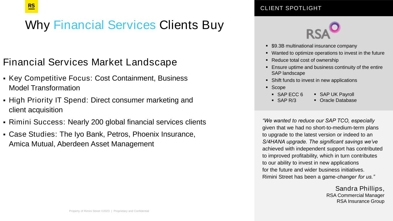 Why Financial Services Clients Buy Property of Rimini Street ©2023 | Proprietary and Confidential 22 Financial Services Market Landscape ▪ Key Competitive Focus: Cost Containment, Business Model Transformation ▪ High Priority IT Spend: Direct consumer marketing and client acquisition ▪ Rimini Success: Nearly 200 global financial services clients ▪ Case Studies: The Iyo Bank, Petros, Phoenix Insurance, Amica Mutual, Aberdeen Asset Management CLIENT SPOTLIGHT Sandra Phillips, RSA Commercial Manager RSA Insurance Group “We wanted to reduce our SAP TCO, especially given that we had no short-to-medium-term plans to upgrade to the latest version or indeed to an S/4HANA upgrade. The significant savings we’ve achieved with independent support has contributed to improved profitability, which in turn contributes to our ability to invest in new applications for the future and wider business initiatives. Rimini Street has been a game-changer for us.” ▪ $9.3B multinational insurance company ▪ Wanted to optimize operations to invest in the future ▪ Reduce total cost of ownership ▪ Ensure uptime and business continuity of the entire SAP landscape ▪ Shift funds to invest in new applications ▪ Scope ▪ SAP ECC 6 ▪ SAP R/3 ▪ SAP UK Payroll ▪ Oracle Database