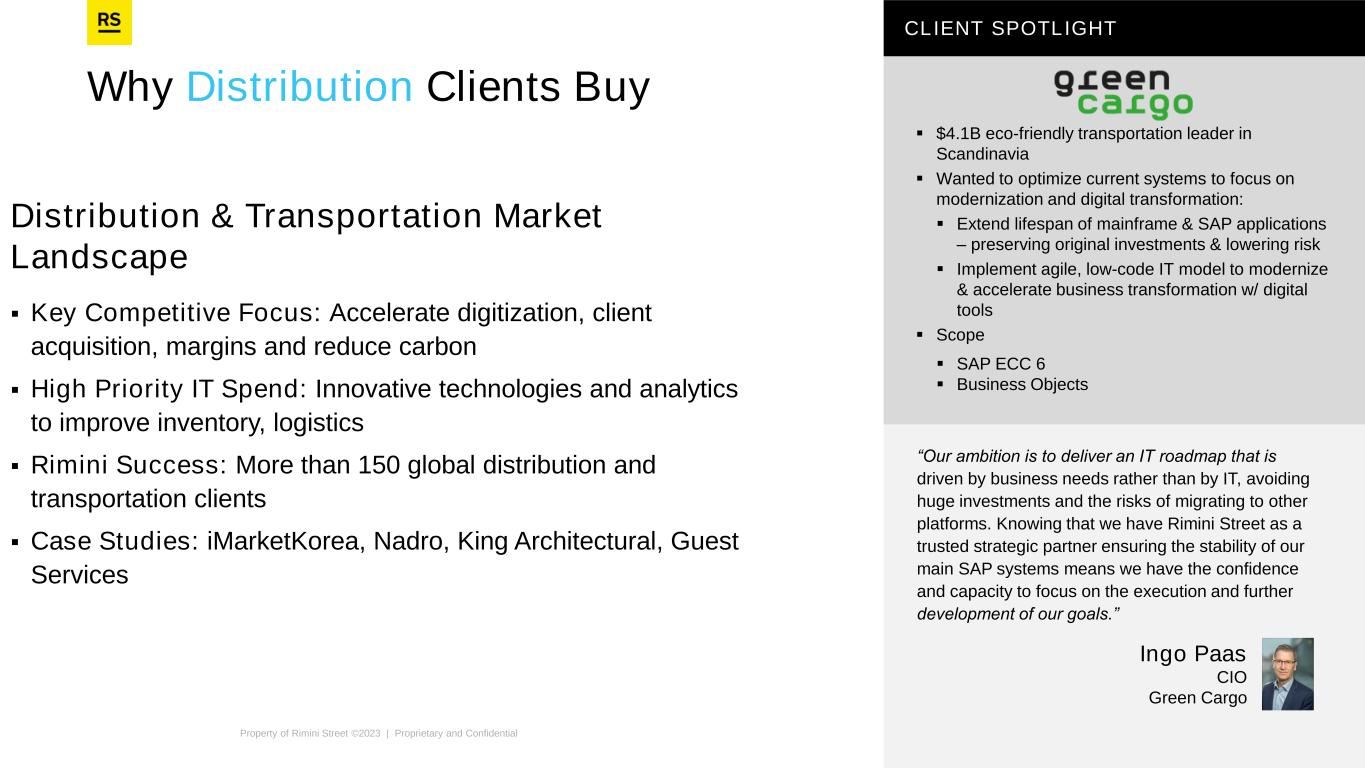 Why Distribution Clients Buy Property of Rimini Street ©2023 | Proprietary and Confidential 25 Distribution & Transportation Market Landscape ▪ Key Competitive Focus: Accelerate digitization, client acquisition, margins and reduce carbon ▪ High Priority IT Spend: Innovative technologies and analytics to improve inventory, logistics ▪ Rimini Success: More than 150 global distribution and transportation clients ▪ Case Studies: iMarketKorea, Nadro, King Architectural, Guest Services “Our ambition is to deliver an IT roadmap that is driven by business needs rather than by IT, avoiding huge investments and the risks of migrating to other platforms. Knowing that we have Rimini Street as a trusted strategic partner ensuring the stability of our main SAP systems means we have the confidence and capacity to focus on the execution and further development of our goals.” CLIENT SPOTLIGHT Ingo Paas CIO Green Cargo ▪ $4.1B eco-friendly transportation leader in Scandinavia ▪ Wanted to optimize current systems to focus on modernization and digital transformation: ▪ Extend lifespan of mainframe & SAP applications – preserving original investments & lowering risk ▪ Implement agile, low-code IT model to modernize & accelerate business transformation w/ digital tools ▪ Scope ▪ SAP ECC 6 ▪ Business Objects