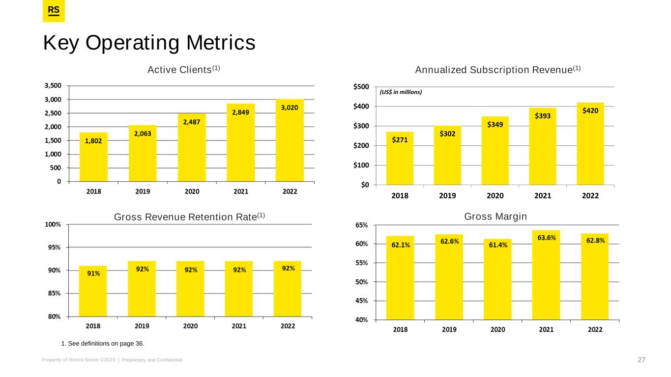 Summary of Operating Metrics Property of Rimini Street ©2023 | Proprietary and Confidential 36 Number of Clients • Active client - Distinct entity, such as a company, an educational or government institution, or a subsidiary, division, or business unit of a company that purchases Rimini Street services to support a specific product • Growth in the number of clients is an indication of the increased adoption of the Company’s enterprise software products and services Annualized Subscription Revenue • The amount of subscription revenue recognized during a quarter and multiplied by four • Gives an indication of the revenue that can be earned in the following 12-month period from the Company’s existing client base assuming no cancellations or price changes occur during that period Gross Revenue Retention Rate • Actual subscription revenue (dollar-based) recognized in a 12-month period from clients that were clients on the day prior to the start of the 12-month period divided by the Company’s annualized subscription revenue as of the day prior to the start of the 12-month period • Provides insight into the quality of Rimini Street’s products and services and the value that the Company’s products and services provide clients Gross Margin • Difference between revenue and the costs incurred in providing the software products and services divided by revenue • Provides an indication of how efficiently and effectively Rimini Street is operating the business and serving clients