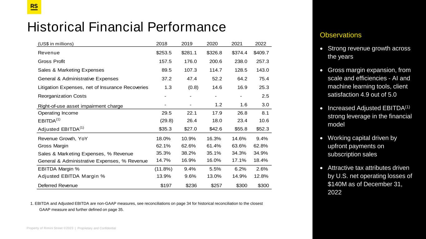 Historical Financial Performance Property of Rimini Street ©2023 | Proprietary and Confidential 28 1. EBITDA and Adjusted EBITDA are non-GAAP measures, see reconciliations on page 34 for historical reconciliation to the closest GAAP measure and further defined on page 35. (US$ in millions) 2018 2019 2020 2021 2022 Revenue $253.5 $281.1 $326.8 $374.4 $409.7 Gross Profit 157.5 176.0 200.6 238.0 257.3 Sales & Marketing Expenses 89.5 107.3 114.7 128.5 143.0 General & Administrative Expenses 37.2 47.4 52.2 64.2 75.4 Litigation Expenses, net of Insurance Recoveries 1.3 (0.8) 14.6 16.9 25.3 Reorganization Costs - - - - 2.5 Right-of-use asset impairment charge - - 1.2 1.6 3.0 Operating Income 29.5 22.1 17.9 26.8 8.1 EBITDA(1) (29.8) 26.4 18.0 23.4 10.6 Adjusted EBITDA(1) $35.3 $27.0 $42.6 $55.8 $52.3 Revenue Growth, YoY 18.0% 10.9% 16.3% 14.6% 9.4% Gross Margin 62.1% 62.6% 61.4% 63.6% 62.8% Sales & Marketing Expenses, % Revenue 35.3% 38.2% 35.1% 34.3% 34.9% General & Administrative Expenses, % Revenue 14.7% 16.9% 16.0% 17.1% 18.4% EBITDA Margin % (11.8%) 9.4% 5.5% 6.2% 2.6% Adjusted EBITDA Margin % 13.9% 9.6% 13.0% 14.9% 12.8% Deferred Revenue $197 $236 $257 $300 $300 Observations • Strong revenue growth across the years • Gross margin expansion, from scale and efficiencies - AI and machine learning tools, client satisfaction 4.9 out of 5.0 • Increased Adjusted EBITDA(1) strong leverage in the financial model • Working capital driven by upfront payments on subscription sales • Attractive tax attributes driven by U.S. net operating losses of $140M as of December 31, 2022