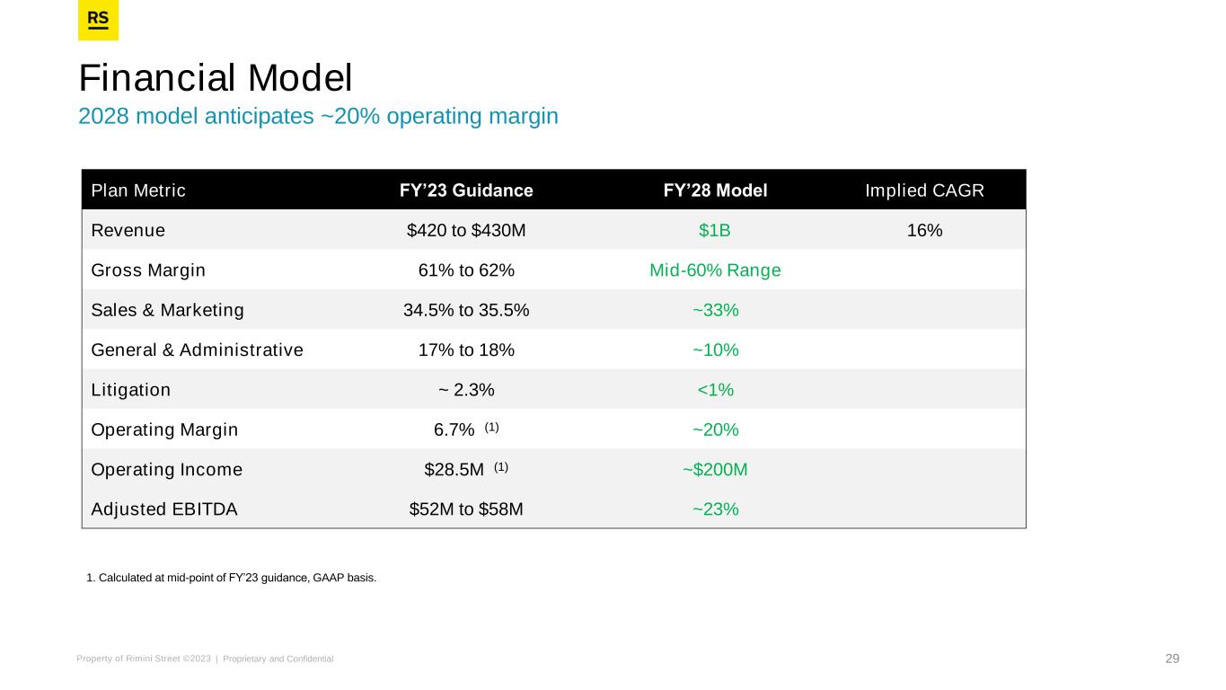 2028 model anticipates ~20% operating margin Financial Model Property of Rimini Street ©2023 | Proprietary and Confidential 29 Plan Metric FY’23 Guidance FY’28 Model Implied CAGR Revenue $420 to $430M $1B 16% Gross Margin 61% to 62% Mid-60% Range Sales & Marketing 34.5% to 35.5% ~33% General & Administrative 17% to 18% ~10% Litigation ~ 2.3% <1% Operating Margin 6.7% (1) ~20% Operating Income $28.5M (1) ~$200M Adjusted EBITDA $52M to $58M ~23% 1. Calculated at mid-point of FY’23 guidance,GAAP basis.