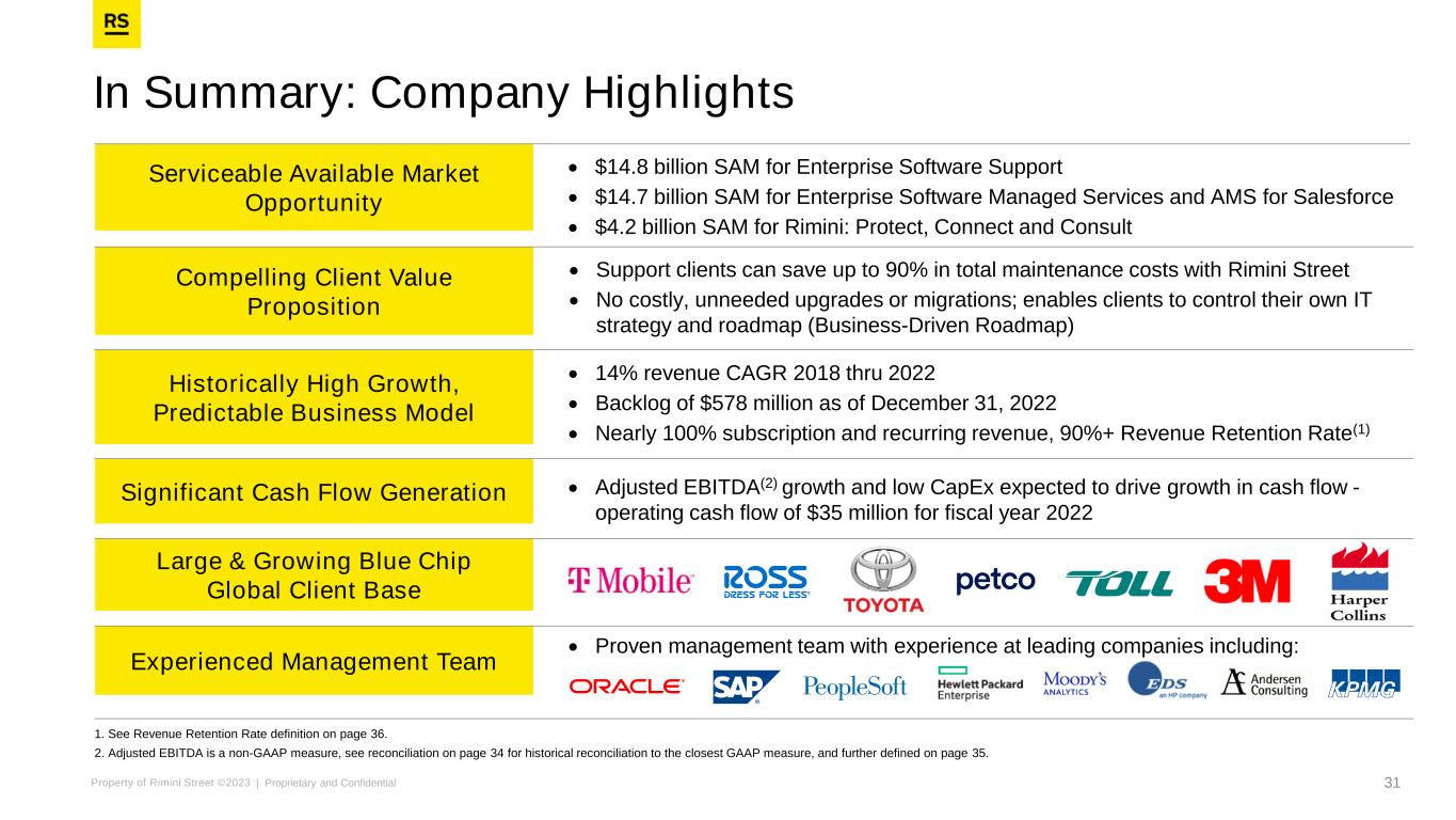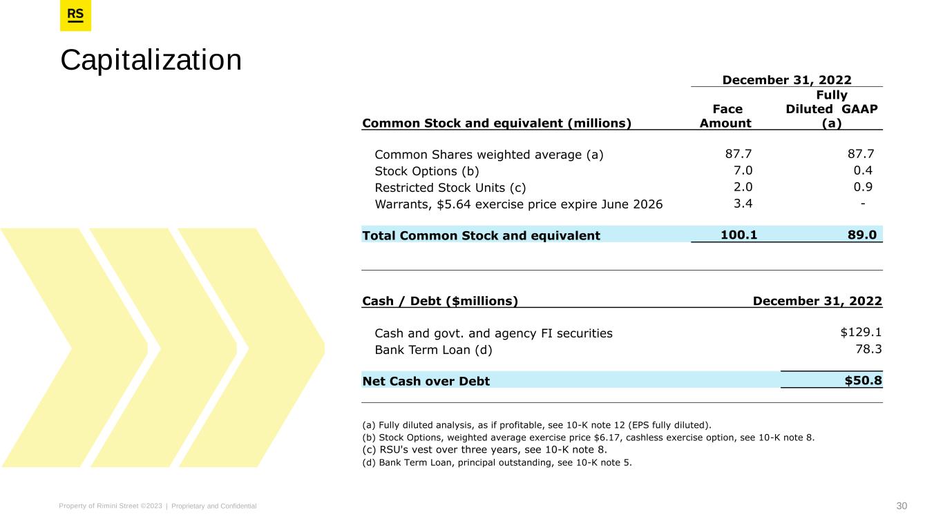Capitalization Property of Rimini Street ©2023 | Proprietary and Confidential 30 December 31, 2022 Common Stock and equivalent (millions) Face Amount Fully Diluted GAAP (a) Common Shares weighted average (a) 87.7 87.7 Stock Options (b) 7.0 0.4 Restricted Stock Units (c) 2.0 0.9 Warrants, $5.64 exercise price expire June 2026 3.4 - Total Common Stock and equivalent 100.1 89.0 Cash / Debt ($millions) December 31, 2022 Cash and govt. and agency FI securities $129.1 Bank Term Loan (d) 78.3 Net Cash over Debt $50.8 (a) Fully diluted analysis, as if profitable, see 10-K note 12 (EPS fully diluted). (b) Stock Options, weighted average exercise price $6.17, cashless exercise option, see 10-K note 8. (c) RSU's vest over three years, see 10-K note 8. (d) Bank Term Loan, principal outstanding, see 10-K note 5.