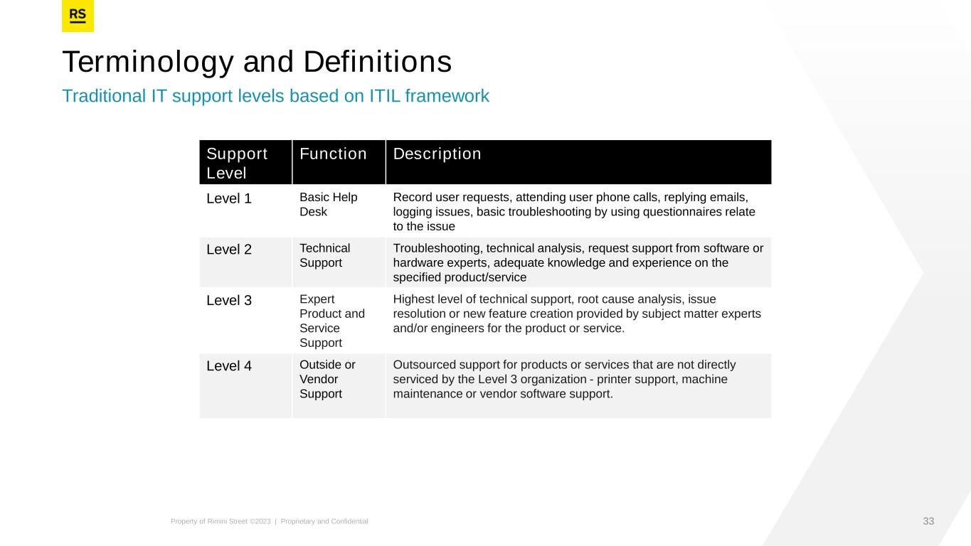 Support Level Function Description Level 1 Basic Help Desk Record user requests, attending user phone calls, replying emails, logging issues, basic troubleshooting by using questionnaires relate to the issue Level 2 Technical Support Troubleshooting, technical analysis, request support from software or hardware experts, adequate knowledge and experience on the specified product/service Level 3 Expert Product and Service Support Highest level of technical support, root cause analysis, issue resolution or new feature creation provided by subject matter experts and/or engineers for the product or service. Level 4 Outside or Vendor Support Outsourced support for products or services that are not directly serviced by the Level 3 organization - printer support, machine maintenance or vendor software support. Terminology and Definitions Property of Rimini Street ©2023 | Proprietary and Confidential 33 Traditional IT support levels based on ITIL framework