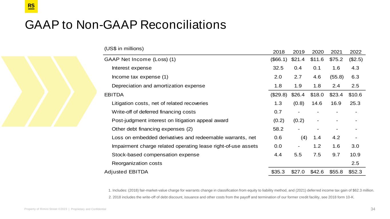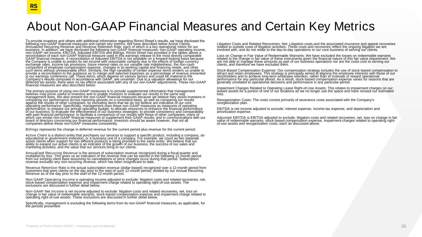 GAAP to Non-GAAP Reconciliations Property of Rimini Street ©2023 | Proprietary and Confidential 34 (US$ in millions) 2018 2019 2020 2021 2022 GAAP Net Income (Loss) (1) ($66.1) $21.4 $11.6 $75.2 ($2.5) Interest expense 32.5 0.4 0.1 1.6 4.3 Income tax expense (1) 2.0 2.7 4.6 (55.8) 6.3 Depreciation and amortization expense 1.8 1.9 1.8 2.4 2.5 EBITDA ($29.8) $26.4 $18.0 $23.4 $10.6 Litigation costs, net of related recoveries 1.3 (0.8) 14.6 16.9 25.3 Write-off of deferred financing costs 0.7 - - - - Post-judgment interest on litigation appeal award (0.2) (0.2) - - - Other debt financing expenses (2) 58.2 - - - - Loss on embedded derivatives and redeemable warrants, net 0.6 (4) 1.4 4.2 - Impairment charge related operating lease right-of-use assets 0.0 - 1.2 1.6 3.0 Stock-based compensation expense 4.4 5.5 7.5 9.7 10.9 Reorganization costs 2.5 Adjusted EBITDA $35.3 $27.0 $42.6 $55.8 $52.3 1. Includes: (2018) fair-market-value charge for warrants change in classification from equity to liability method, and (2021) deferred income tax gain of $62.3 million. 2. 2018 includes the write-off of debt discount, issuance and other costs from the payoff and termination of our former credit facility, see 2018 form 10-K.