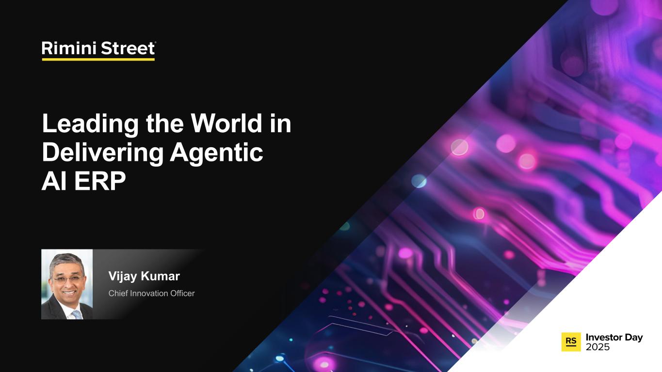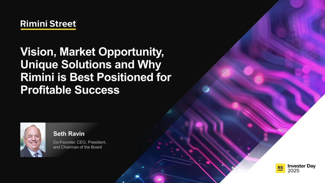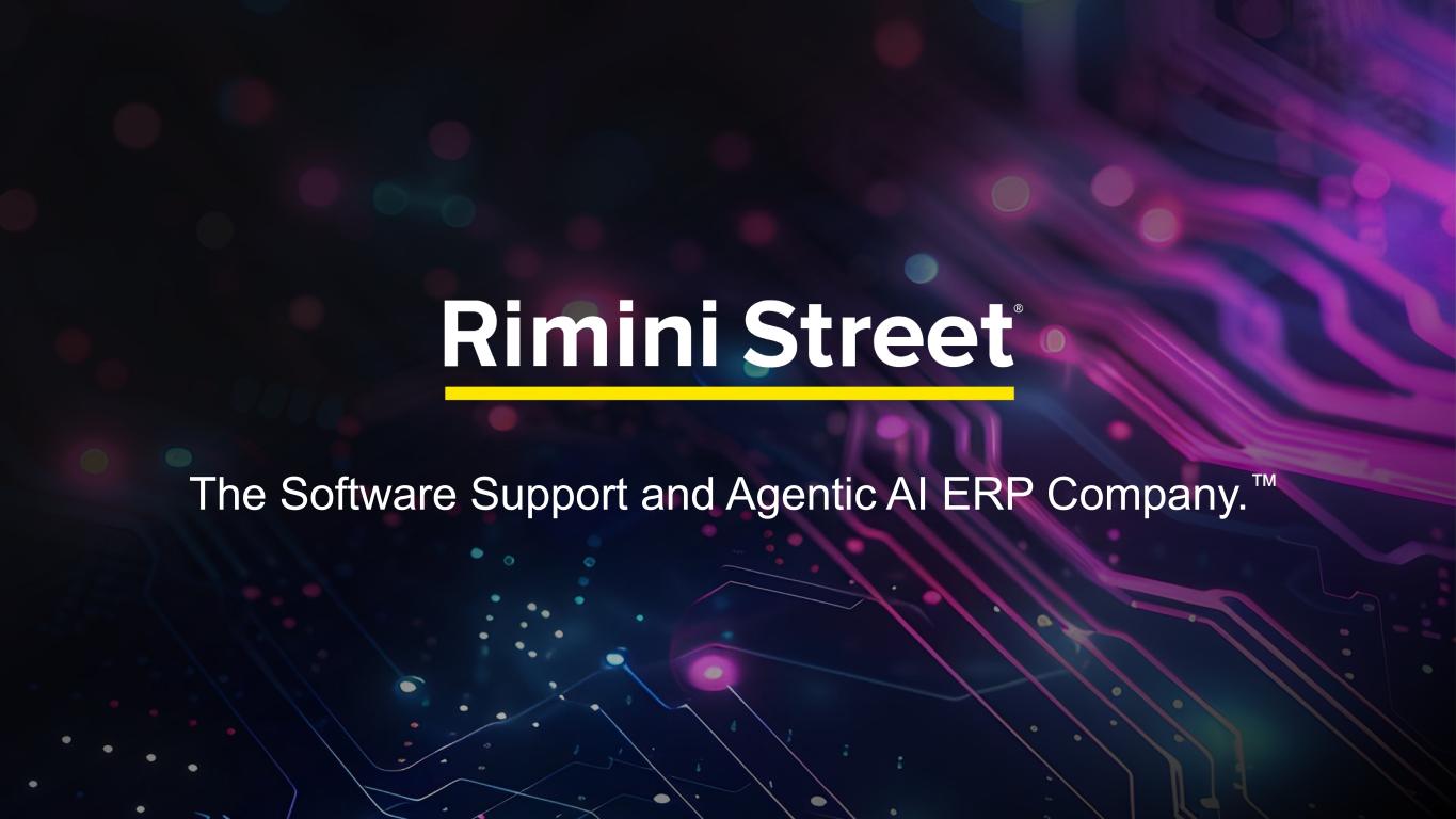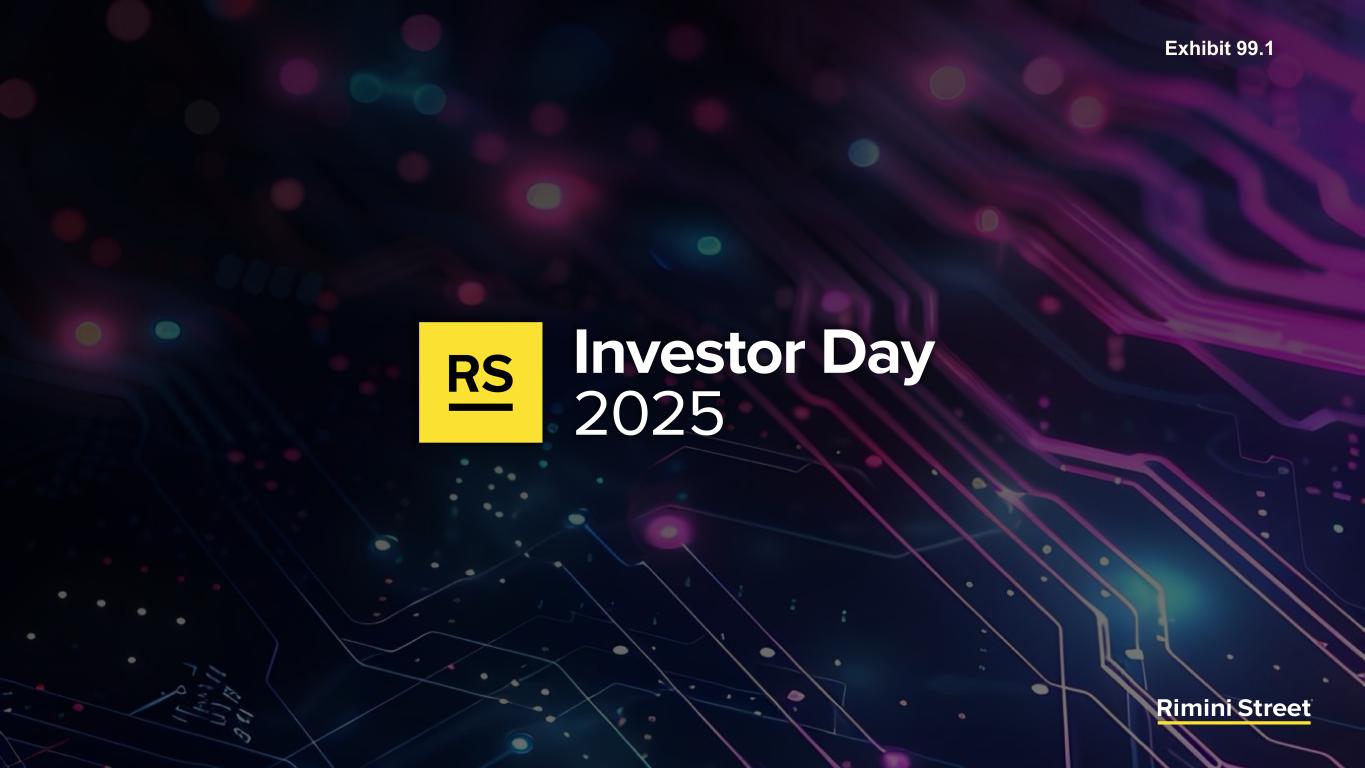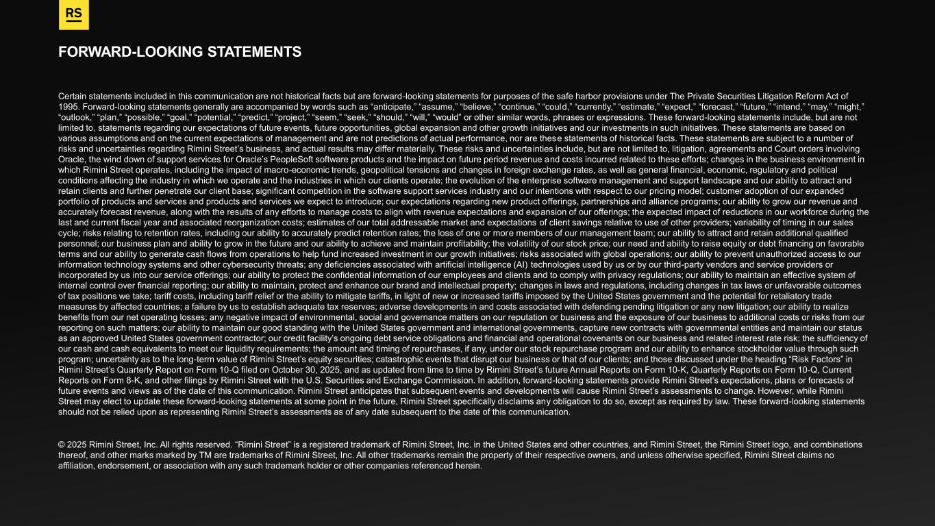 FORWARD-LOOKING STATEMENTS Certain statements included in this communication are not historical facts but are forward-looking statements for purposes of the safe harbor provisions under The Private Securities Litigation Reform Act of 1995. Forward-looking statements generally are accompanied by words such as “anticipate,” “assume,” “believe,” “continue,” “could,” “currently,” “estimate,” “expect,” “forecast,” “future,” “intend,” “may,” “might,” “outlook,” “plan,” “possible,” “goal,” “potential,” “predict,” “project,” “seem,” “seek,” “should,” “will,” “would” or other similar words, phrases or expressions. These forward-looking statements include, but are not limited to, statements regarding our expectations of future events, future opportunities, global expansion and other growth initiatives and our investments in such initiatives. These statements are based on various assumptions and on the current expectations of management and are not predictions of actual performance, nor are these statements of historical facts. These statements are subject to a number of risks and uncertainties regarding Rimini Street’s business, and actual results may differ materially. These risks and uncerta inties include, but are not limited to, litigation, agreements and Court orders involving Oracle, the wind down of support services for Oracle’s PeopleSoft software products and the impact on future period revenue and costs incurred related to these efforts; changes in the business environment in which Rimini Street operates, including the impact of macro-economic trends, geopolitical tensions and changes in foreign exchange rates, as well as general financial, economic, regulatory and political conditions affecting the industry in which we operate and the industries in which our clients operate; the evolution of the enterprise software management and support landscape and our ability to attract and retain clients and further penetrate our client base; significant competition in the software support services industry and our intentions with respect to our pricing model; customer adoption of our expanded portfolio of products and services and products and services we expect to introduce; our expectations regarding new product offerings, partnerships and alliance programs; our ability to grow our revenue and accurately forecast revenue, along with the results of any efforts to manage costs to align with revenue expectations and expansion of our offerings; the expected impact of reductions in our workforce during the last and current fiscal year and associated reorganization costs; estimates of our total addressable market and expectations of client savings relative to use of other providers; variability of timing in our sales cycle; risks relating to retention rates, including our ability to accurately predict retention rates; the loss of one or more members of our management team; our ability to attract and retain additional qualified personnel; our business plan and ability to grow in the future and our ability to achieve and maintain profitability; the volatility of our stock price; our need and ability to raise equity or debt financing on favorable terms and our ability to generate cash flows from operations to help fund increased investment in our growth initiatives; risks associated with global operations; our ability to prevent unauthorized access to our information technology systems and other cybersecurity threats; any deficiencies associated with artificial intelligence (AI) technologies used by us or by our third-party vendors and service providers or incorporated by us into our service offerings; our ability to protect the confidential information of our employees and clients and to comply with privacy regulations; our ability to maintain an effective system of internal control over financial reporting; our ability to maintain, protect and enhance our brand and intellectual property; changes in laws and regulations, including changes in tax laws or unfavorable outcomes of tax positions we take; tariff costs, including tariff relief or the ability to mitigate tariffs, in light of new or increased tariffs imposed by the United States government and the potential for retaliatory trade measures by affected countries; a failure by us to establish adequate tax reserves; adverse developments in and costs associated with defending pending litigation or any new litigation; our ability to realize benefits from our net operating losses; any negative impact of environmental, social and governance matters on our reputation or business and the exposure of our business to additional costs or risks from our reporting on such matters; our ability to maintain our good standing with the United States government and international governments, capture new contracts with governmental entities and maintain our status as an approved United States government contractor; our credit facility’s ongoing debt service obligations and financial and operational covenants on our business and related interest rate risk; the sufficiency of our cash and cash equivalents to meet our liquidity requirements; the amount and timing of repurchases, if any, under our stock repurchase program and our ability to enhance stockholder value through such program; uncertainty as to the long-term value of Rimini Street’s equity securities; catastrophic events that disrupt our business or that of our clients; and those discussed under the heading “Risk Factors” in Rimini Street’s Quarterly Report on Form 10-Q filed on October 30, 2025, and as updated from time to time by Rimini Street’s future Annual Reports on Form 10-K, Quarterly Reports on Form 10-Q, Current Reports on Form 8-K, and other filings by Rimini Street with the U.S. Securities and Exchange Commission. In addition, forward-looking statements provide Rimini Street’s expect