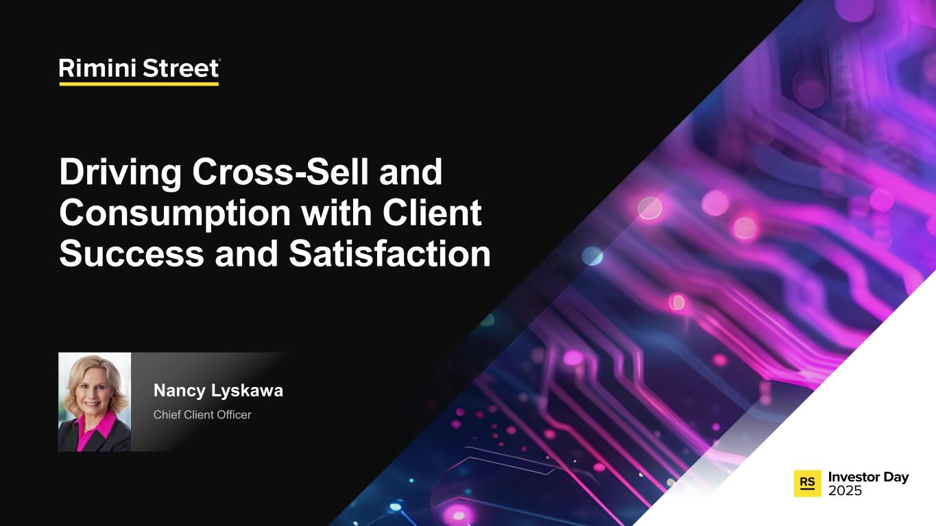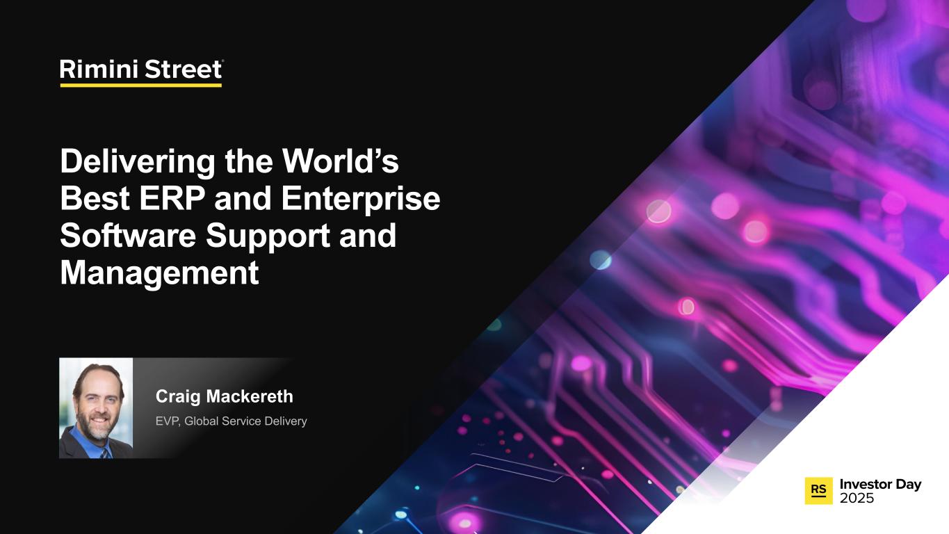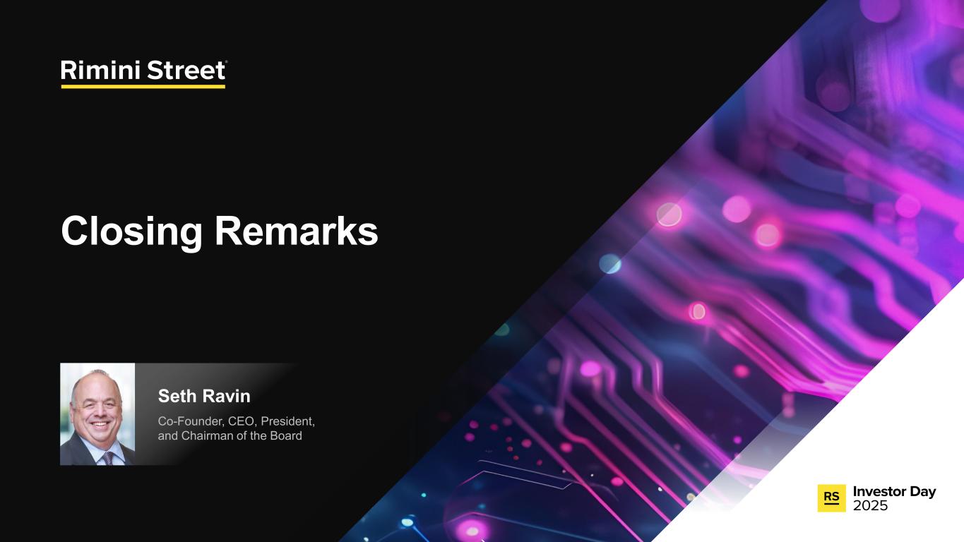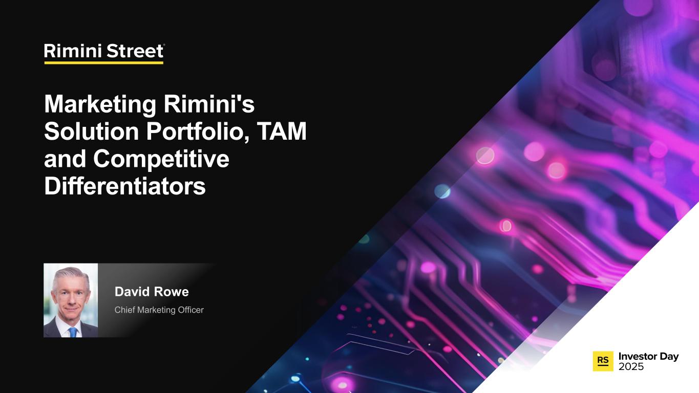 FORWARD-LOOKING STATEMENTS Certain statements included in this communication are not historical facts but are forward-looking statements for purposes of the safe harbor provisions under The Private Securities Litigation Reform Act of 1995. Forward-looking statements generally are accompanied by words such as “anticipate,” “assume,” “believe,” “continue,” “could,” “currently,” “estimate,” “expect,” “forecast,” “future,” “intend,” “may,” “might,” “outlook,” “plan,” “possible,” “goal,” “potential,” “predict,” “project,” “seem,” “seek,” “should,” “will,” “would” or other similar words, phrases or expressions. These forward-looking statements include, but are not limited to, statements regarding our expectations of future events, future opportunities, global expansion and other growth initiatives and our investments in such initiatives. These statements are based on various assumptions and on the current expectations of management and are not predictions of actual performance, nor are these statements of historical facts. These statements are subject to a number of risks and uncertainties regarding Rimini Street’s business, and actual results may differ materially. These risks and uncerta inties include, but are not limited to, litigation, agreements and Court orders involving Oracle, the wind down of support services for Oracle’s PeopleSoft software products and the impact on future period revenue and costs incurred related to these efforts; changes in the business environment in which Rimini Street operates, including the impact of macro-economic trends, geopolitical tensions and changes in foreign exchange rates, as well as general financial, economic, regulatory and political conditions affecting the industry in which we operate and the industries in which our clients operate; the evolution of the enterprise software management and support landscape and our ability to attract and retain clients and further penetrate our client base; significant competition in the software support services industry and our intentions with respect to our pricing model; customer adoption of our expanded portfolio of products and services and products and services we expect to introduce; our expectations regarding new product offerings, partnerships and alliance programs; our ability to grow our revenue and accurately forecast revenue, along with the results of any efforts to manage costs to align with revenue expectations and expansion of our offerings; the expected impact of reductions in our workforce during the last and current fiscal year and associated reorganization costs; estimates of our total addressable market and expectations of client savings relative to use of other providers; variability of timing in our sales cycle; risks relating to retention rates, including our ability to accurately predict retention rates; the loss of one or more members of our management team; our ability to attract and retain additional qualified personnel; our business plan and ability to grow in the future and our ability to achieve and maintain profitability; the volatility of our stock price; our need and ability to raise equity or debt financing on favorable terms and our ability to generate cash flows from operations to help fund increased investment in our growth initiatives; risks associated with global operations; our ability to prevent unauthorized access to our information technology systems and other cybersecurity threats; any deficiencies associated with artificial intelligence (AI) technologies used by us or by our third-party vendors and service providers or incorporated by us into our service offerings; our ability to protect the confidential information of our employees and clients and to comply with privacy regulations; our ability to maintain an effective system of internal control over financial reporting; our ability to maintain, protect and enhance our brand and intellectual property; changes in laws and regulations, including changes in tax laws or unfavorable outcomes of tax positions we take; tariff costs, including tariff relief or the ability to mitigate tariffs, in light of new or increased tariffs imposed by the United States government and the potential for retaliatory trade measures by affected countries; a failure by us to establish adequate tax reserves; adverse developments in and costs associated with defending pending litigation or any new litigation; our ability to realize benefits from our net operating losses; any negative impact of environmental, social and governance matters on our reputation or business and the exposure of our business to additional costs or risks from our reporting on such matters; our ability to maintain our good standing with the United States government and international governments, capture new contracts with governmental entities and maintain our status as an approved United States government contractor; our credit facility’s ongoing debt service obligations and financial and operational covenants on our business and related interest rate risk; the sufficiency of our cash and cash equivalents to meet our liquidity requirements; the amount and timing of repurchases, if any, under our stock repurchase program and our ability to enhance stockholder value through such program; uncertainty as to the long-term value of Rimini Street’s equity securities; catastrophic events that disrupt our business or that of our clients; and those discussed under the heading “Risk Factors” in Rimini Street’s Quarterly Report on Form 10-Q filed on October 30, 2025, and as updated from time to time by Rimini Street’s future Annual Reports on Form 10-K, Quarterly Reports on Form 10-Q, Current Reports on Form 8-K, and other filings by Rimini Street with the U.S. Securities and Exchange Commission. In addition, forward-looking statements provide Rimini Street’s expect
