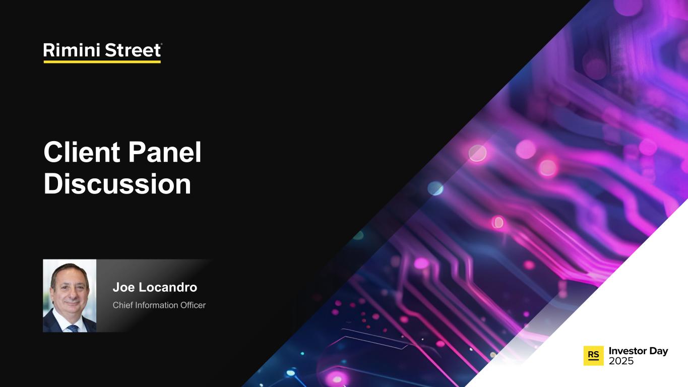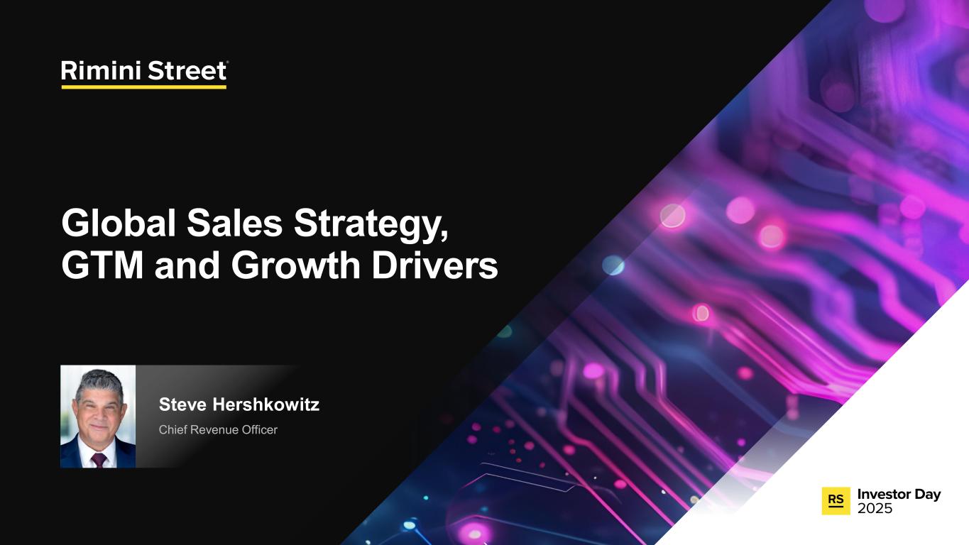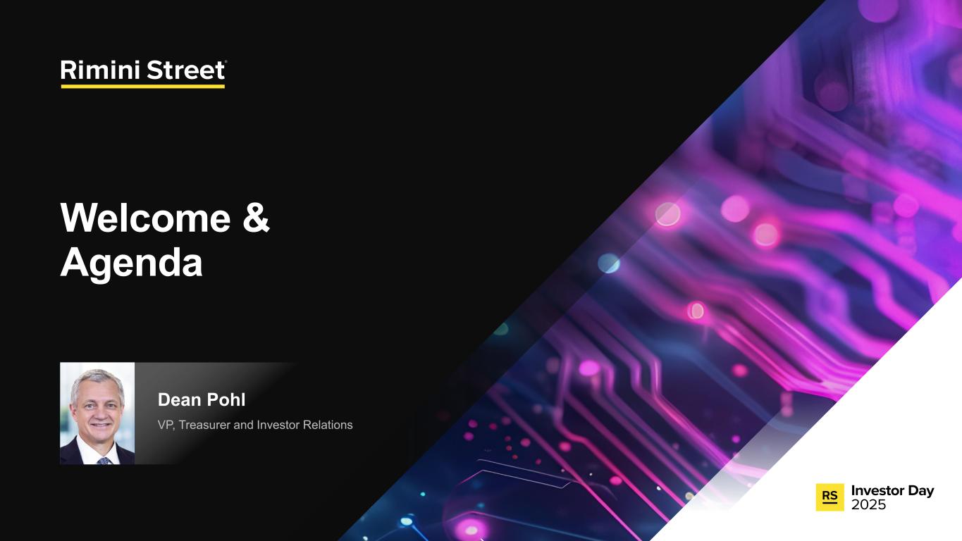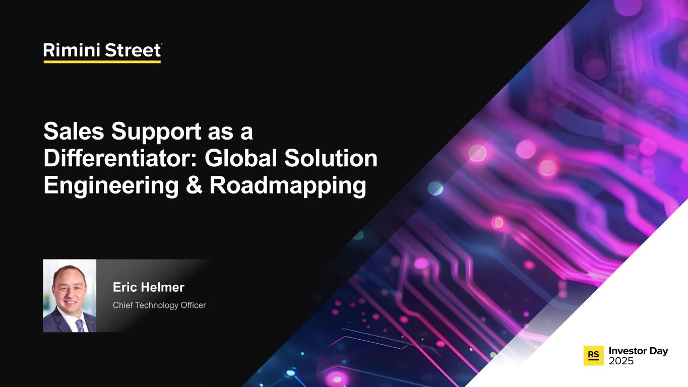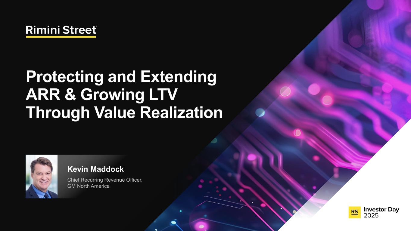 FORWARD-LOOKING STATEMENTS Certain statements included in this communication are not historical facts but are forward-looking statements for purposes of the safe harbor provisions under The Private Securities Litigation Reform Act of 1995. Forward-looking statements generally are accompanied by words such as “anticipate,” “assume,” “believe,” “continue,” “could,” “currently,” “estimate,” “expect,” “forecast,” “future,” “intend,” “may,” “might,” “outlook,” “plan,” “possible,” “goal,” “potential,” “predict,” “project,” “seem,” “seek,” “should,” “will,” “would” or other similar words, phrases or expressions. These forward-looking statements include, but are not limited to, statements regarding our expectations of future events, future opportunities, global expansion and other growth initiatives and our investments in such initiatives. These statements are based on various assumptions and on the current expectations of management and are not predictions of actual performance, nor are these statements of historical facts. These statements are subject to a number of risks and uncertainties regarding Rimini Street’s business, and actual results may differ materially. These risks and uncerta inties include, but are not limited to, litigation, agreements and Court orders involving Oracle, the wind down of support services for Oracle’s PeopleSoft software products and the impact on future period revenue and costs incurred related to these efforts; changes in the business environment in which Rimini Street operates, including the impact of macro-economic trends, geopolitical tensions and changes in foreign exchange rates, as well as general financial, economic, regulatory and political conditions affecting the industry in which we operate and the industries in which our clients operate; the evolution of the enterprise software management and support landscape and our ability to attract and retain clients and further penetrate our client base; significant competition in the software support services industry and our intentions with respect to our pricing model; customer adoption of our expanded portfolio of products and services and products and services we expect to introduce; our expectations regarding new product offerings, partnerships and alliance programs; our ability to grow our revenue and accurately forecast revenue, along with the results of any efforts to manage costs to align with revenue expectations and expansion of our offerings; the expected impact of reductions in our workforce during the last and current fiscal year and associated reorganization costs; estimates of our total addressable market and expectations of client savings relative to use of other providers; variability of timing in our sales cycle; risks relating to retention rates, including our ability to accurately predict retention rates; the loss of one or more members of our management team; our ability to attract and retain additional qualified personnel; our business plan and ability to grow in the future and our ability to achieve and maintain profitability; the volatility of our stock price; our need and ability to raise equity or debt financing on favorable terms and our ability to generate cash flows from operations to help fund increased investment in our growth initiatives; risks associated with global operations; our ability to prevent unauthorized access to our information technology systems and other cybersecurity threats; any deficiencies associated with artificial intelligence (AI) technologies used by us or by our third-party vendors and service providers or incorporated by us into our service offerings; our ability to protect the confidential information of our employees and clients and to comply with privacy regulations; our ability to maintain an effective system of internal control over financial reporting; our ability to maintain, protect and enhance our brand and intellectual property; changes in laws and regulations, including changes in tax laws or unfavorable outcomes of tax positions we take; tariff costs, including tariff relief or the ability to mitigate tariffs, in light of new or increased tariffs imposed by the United States government and the potential for retaliatory trade measures by affected countries; a failure by us to establish adequate tax reserves; adverse developments in and costs associated with defending pending litigation or any new litigation; our ability to realize benefits from our net operating losses; any negative impact of environmental, social and governance matters on our reputation or business and the exposure of our business to additional costs or risks from our reporting on such matters; our ability to maintain our good standing with the United States government and international governments, capture new contracts with governmental entities and maintain our status as an approved United States government contractor; our credit facility’s ongoing debt service obligations and financial and operational covenants on our business and related interest rate risk; the sufficiency of our cash and cash equivalents to meet our liquidity requirements; the amount and timing of repurchases, if any, under our stock repurchase program and our ability to enhance stockholder value through such program; uncertainty as to the long-term value of Rimini Street’s equity securities; catastrophic events that disrupt our business or that of our clients; and those discussed under the heading “Risk Factors” in Rimini Street’s Quarterly Report on Form 10-Q filed on October 30, 2025, and as updated from time to time by Rimini Street’s future Annual Reports on Form 10-K, Quarterly Reports on Form 10-Q, Current Reports on Form 8-K, and other filings by Rimini Street with the U.S. Securities and Exchange Commission. In addition, forward-looking statements provide Rimini Street’s expect