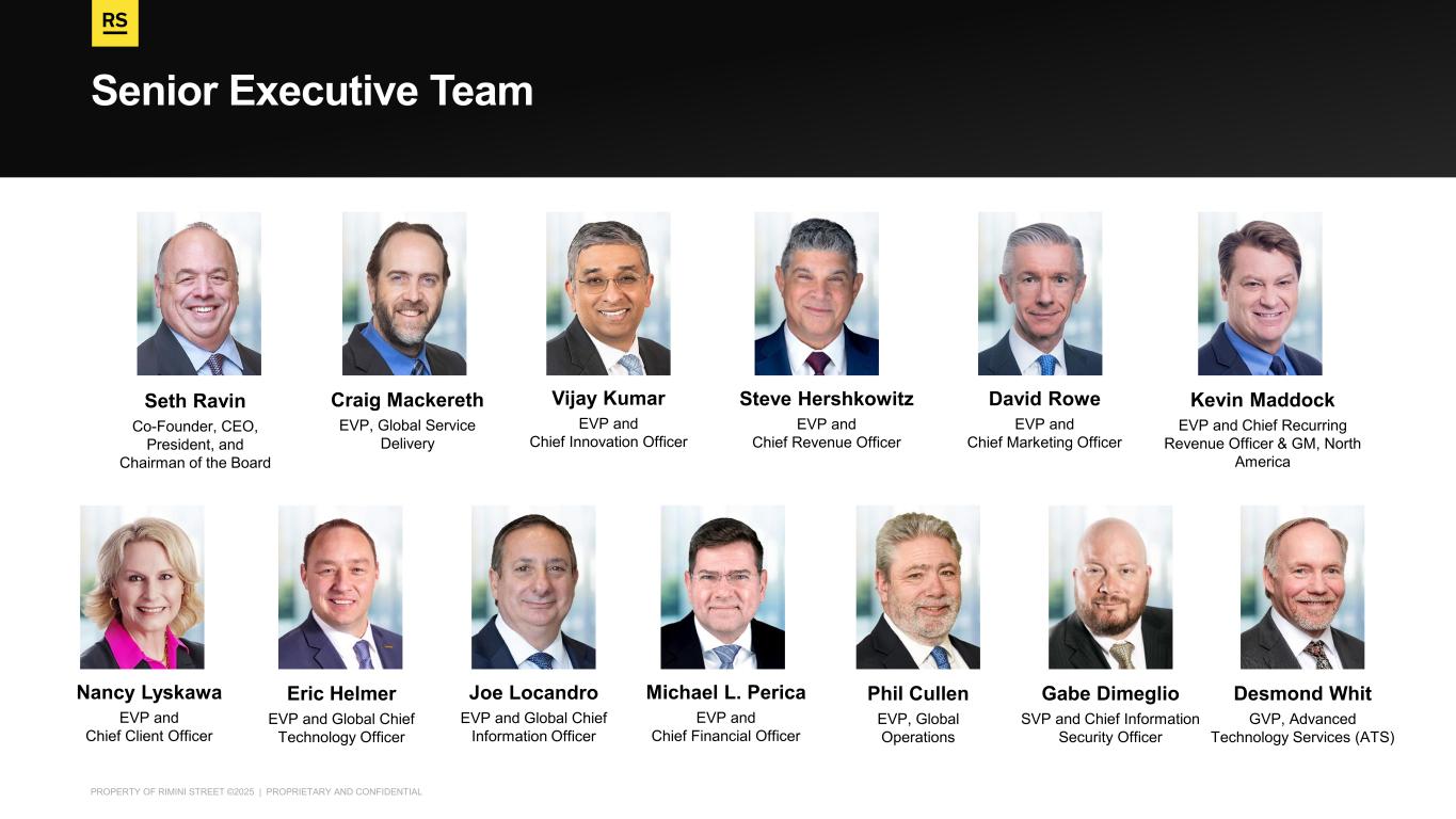 PROPERTY OF RIMINI STREET ©2025 | PROPRIETARY AND CONFIDENTIAL Senior Executive Team Seth Ravin Co-Founder, CEO, President, and Chairman of the Board Steve Hershkowitz EVP and Chief Revenue Officer David Rowe EVP and Chief Marketing Officer Vijay Kumar EVP and Chief Innovation Officer Kevin Maddock EVP and Chief Recurring Revenue Officer & GM, North America Craig Mackereth EVP, Global Service Delivery Michael L. Perica EVP and Chief Financial Officer Nancy Lyskawa EVP and Chief Client Officer Joe Locandro EVP and Global Chief Information Officer Eric Helmer EVP and Global Chief Technology Officer Phil Cullen EVP, Global Operations Gabe Dimeglio SVP and Chief Information Security Officer Desmond Whit GVP, Advanced Technology Services (ATS)
