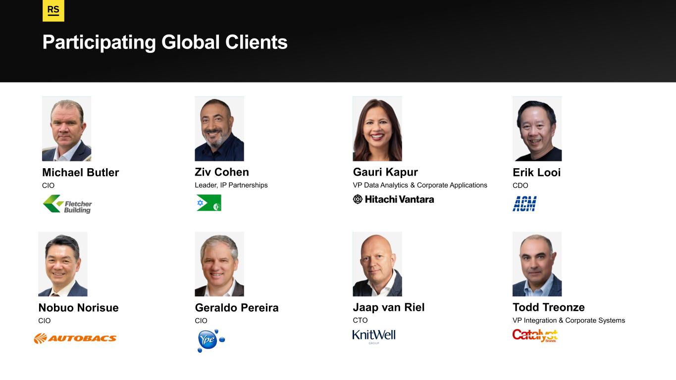 Participating Global Clients Todd Treonze VP Integration & Corporate Systems Ziv Cohen Leader, IP Partnerships Jaap van Riel CTO Gauri Kapur VP Data Analytics & Corporate Applications Michael Butler CIO Geraldo Pereira CIO Nobuo Norisue CIO Erik Looi CDO