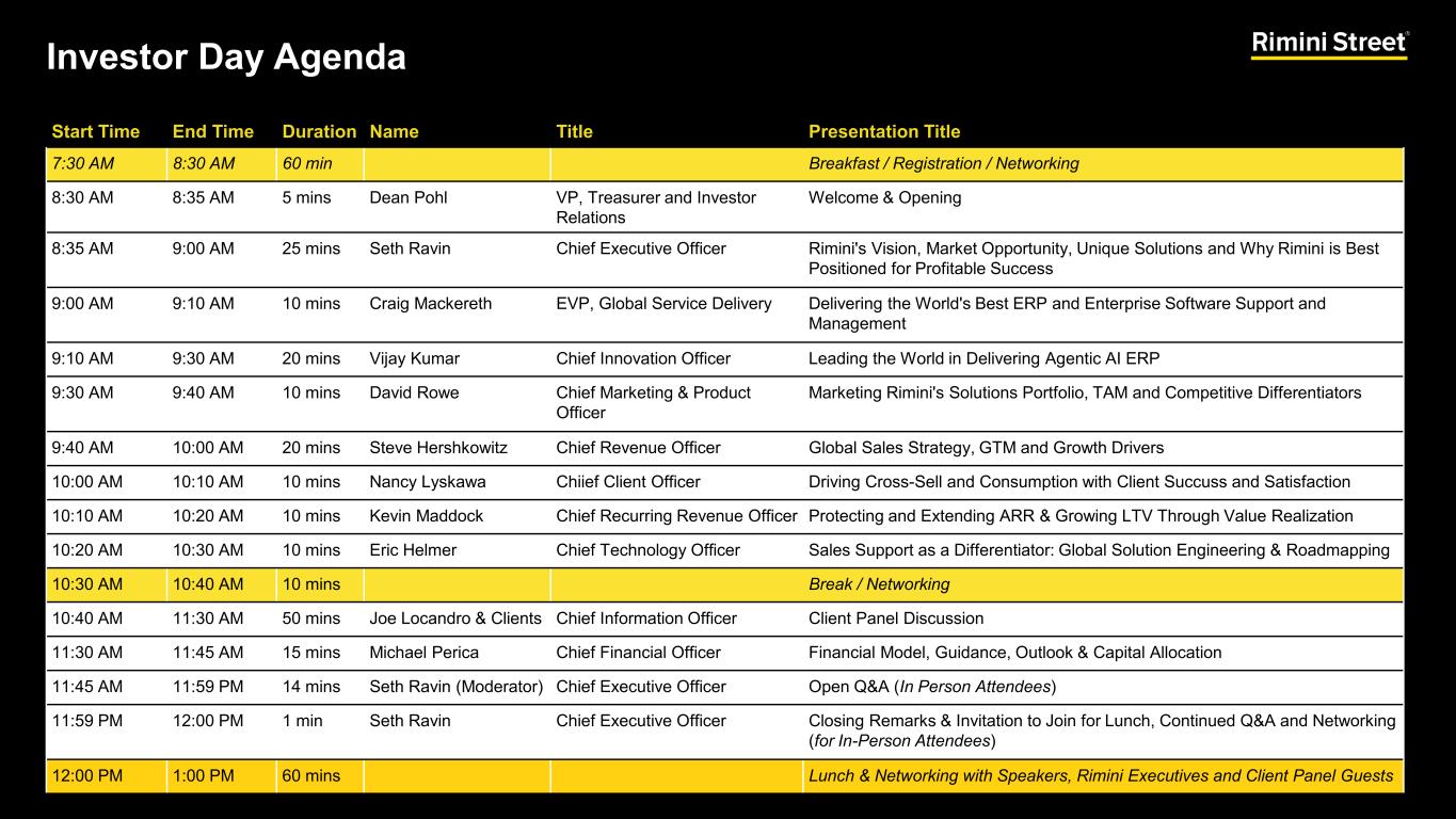 Start Time End Time Duration Name Title Presentation Title 7:30 AM 8:30 AM 60 min Breakfast / Registration / Networking 8:30 AM 8:35 AM 5 mins Dean Pohl VP, Treasurer and Investor Relations Welcome & Opening 8:35 AM 9:00 AM 25 mins Seth Ravin Chief Executive Officer Rimini's Vision, Market Opportunity, Unique Solutions and Why Rimini is Best Positioned for Profitable Success 9:00 AM 9:10 AM 10 mins Craig Mackereth EVP, Global Service Delivery Delivering the World's Best ERP and Enterprise Software Support and Management 9:10 AM 9:30 AM 20 mins Vijay Kumar Chief Innovation Officer Leading the World in Delivering Agentic AI ERP 9:30 AM 9:40 AM 10 mins David Rowe Chief Marketing & Product Officer Marketing Rimini's Solutions Portfolio, TAM and Competitive Differentiators 9:40 AM 10:00 AM 20 mins Steve Hershkowitz Chief Revenue Officer Global Sales Strategy, GTM and Growth Drivers 10:00 AM 10:10 AM 10 mins Nancy Lyskawa Chiief Client Officer Driving Cross-Sell and Consumption with Client Succuss and Satisfaction 10:10 AM 10:20 AM 10 mins Kevin Maddock Chief Recurring Revenue Officer Protecting and Extending ARR & Growing LTV Through Value Realization 10:20 AM 10:30 AM 10 mins Eric Helmer Chief Technology Officer Sales Support as a Differentiator: Global Solution Engineering & Roadmapping 10:30 AM 10:40 AM 10 mins Break / Networking 10:40 AM 11:30 AM 50 mins Joe Locandro & Clients Chief Information Officer Client Panel Discussion 11:30 AM 11:45 AM 15 mins Michael Perica Chief Financial Officer Financial Model, Guidance, Outlook & Capital Allocation 11:45 AM 11:59 PM 14 mins Seth Ravin (Moderator) Chief Executive Officer Open Q&A (In Person Attendees) 11:59 PM 12:00 PM 1 min Seth Ravin Chief Executive Officer Closing Remarks & Invitation to Join for Lunch, Continued Q&A and Networking (for In-Person Attendees) 12:00 PM 1:00 PM 60 mins Lunch & Networking with Speakers, Rimini Executives and Client Panel Guests Investor Day Agenda