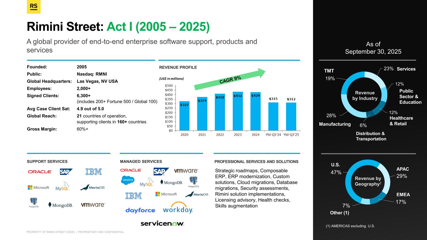 PROPERTY OF RIMINI STREET ©2025 | PROPRIETARY AND CONFIDENTIAL A global provider of end-to-end enterprise software support, products and services Rimini Street: Act I (2005 – 2025) 28% 19% 23% 12% 12% 6%Manufacturing TMT Services Public Sector & Education Healthcare & Retail Distribution & Transportation 47% 29% 17% 7% APAC EMEA Other (1) U.S. Revenue by Industry Revenue by Geography2 As of September 30, 2025 (1) AMERICAS excluding. U.S. Founded: 2005 Public: Nasdaq: RMNI Global Headquarters: Las Vegas, NV USA Employees: 2,000+ Signed Clients: 6,300+ (includes 200+ Fortune 500 / Global 100) Avg Case Client Sat: 4.9 out of 5.0 Global Reach: 21 countries of operation, supporting clients in 160+ countries Gross Margin: 60%+ Supported Products and Services PROFESSIONAL SERVICES AND SOLUTIONSMANAGED SERVICESSUPPORT SERVICES Strategic roadmaps, Composable ERP, ERP modernization, Custom solutions, Cloud migrations, Database migrations, Security assessments, Rimini solution implementations, Licensing advisory, Health checks, Skills augmentation REVENUE PROFILE