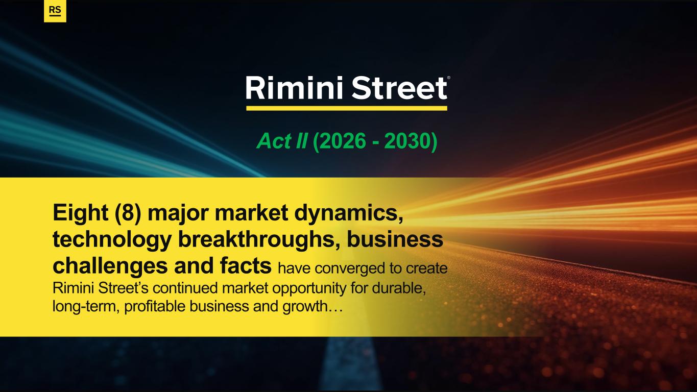 Eight (8) major market dynamics, technology breakthroughs, business challenges and facts have converged to create Rimini Street’s continued market opportunity for durable, long-term, profitable business and growth… Act II (2026 - 2030)