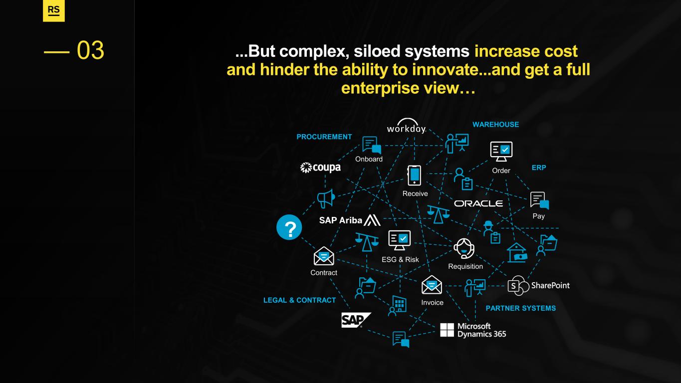 ? LEGAL & CONTRACT Contract Onboard Requisition Order Receive Invoice Pay ESG & Risk PARTNER SYSTEMS PROCUREMENT ERP WAREHOUSE ...But complex, siloed systems increase cost and hinder the ability to innovate...and get a full enterprise view… — 03