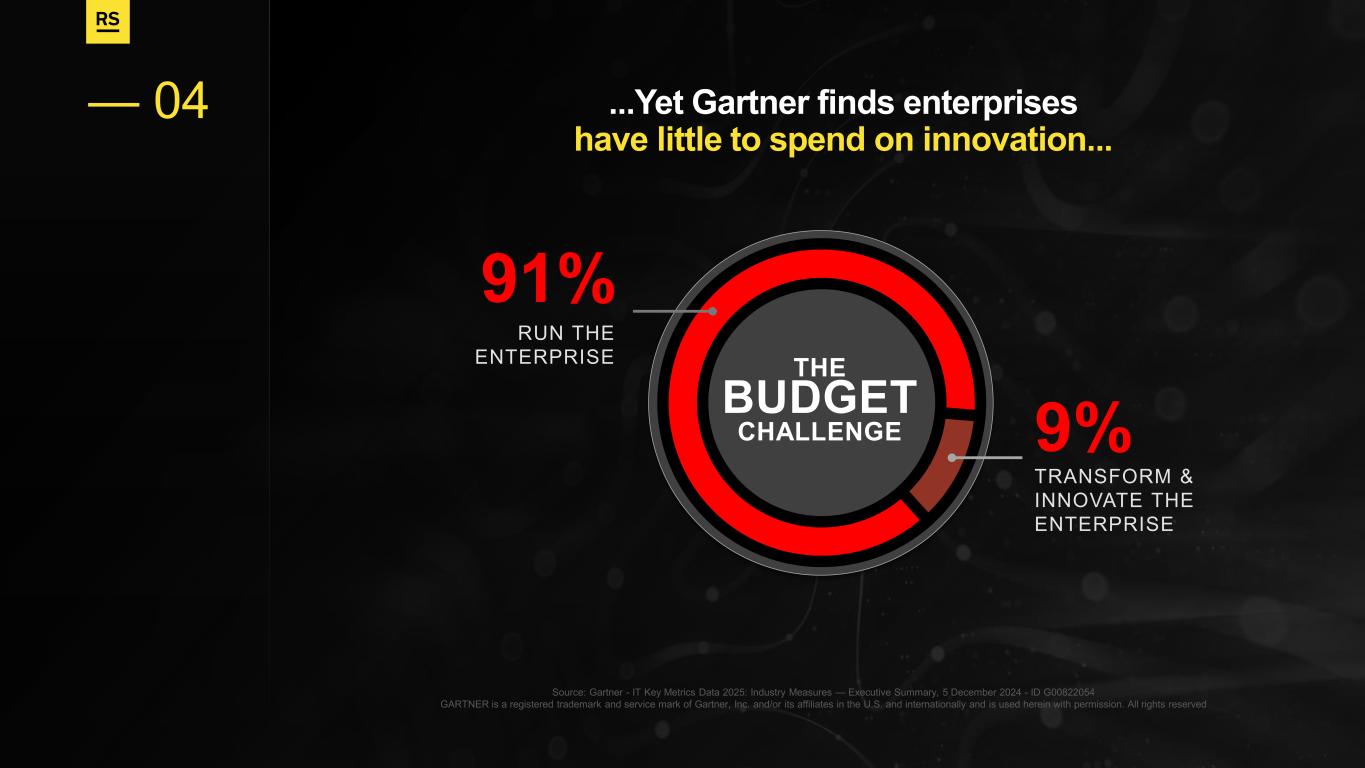 Source: Gartner - IT Key Metrics Data 2025: Industry Measures — Executive Summary, 5 December 2024 - ID G00822054 GARTNER is a registered trademark and service mark of Gartner, Inc. and/or its affiliates in the U.S. and internationally and is used herein with permission. All rights reserved ...Yet Gartner finds enterprises have little to spend on innovation... — 04 THE BUDGET CHALLENGE 91% RUN THE ENTERPRISE 9% TRANSFORM & INNOVATE THE ENTERPRISE