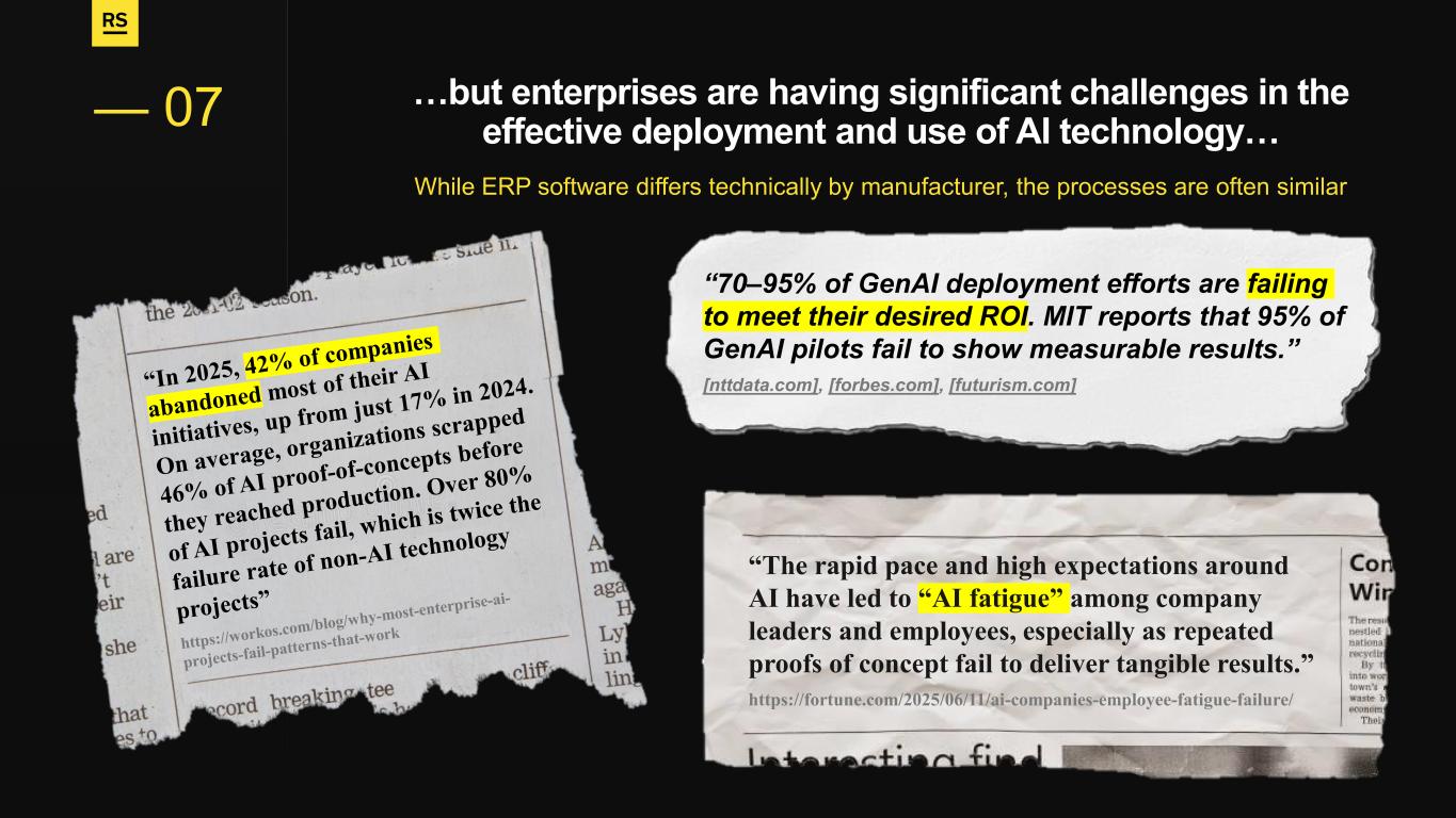 …but enterprises are having significant challenges in the effective deployment and use of AI technology… While ERP software differs technically by manufacturer, the processes are often similar — 07 “70–95% of GenAI deployment efforts are failing to meet their desired ROI. MIT reports that 95% of GenAI pilots fail to show measurable results.” [nttdata.com], [forbes.com], [futurism.com] “The rapid pace and high expectations around AI have led to “AI fatigue” among company leaders and employees, especially as repeated proofs of concept fail to deliver tangible results.” https://fortune.com/2025/06/11/ai-companies-employee-fatigue-failure/
