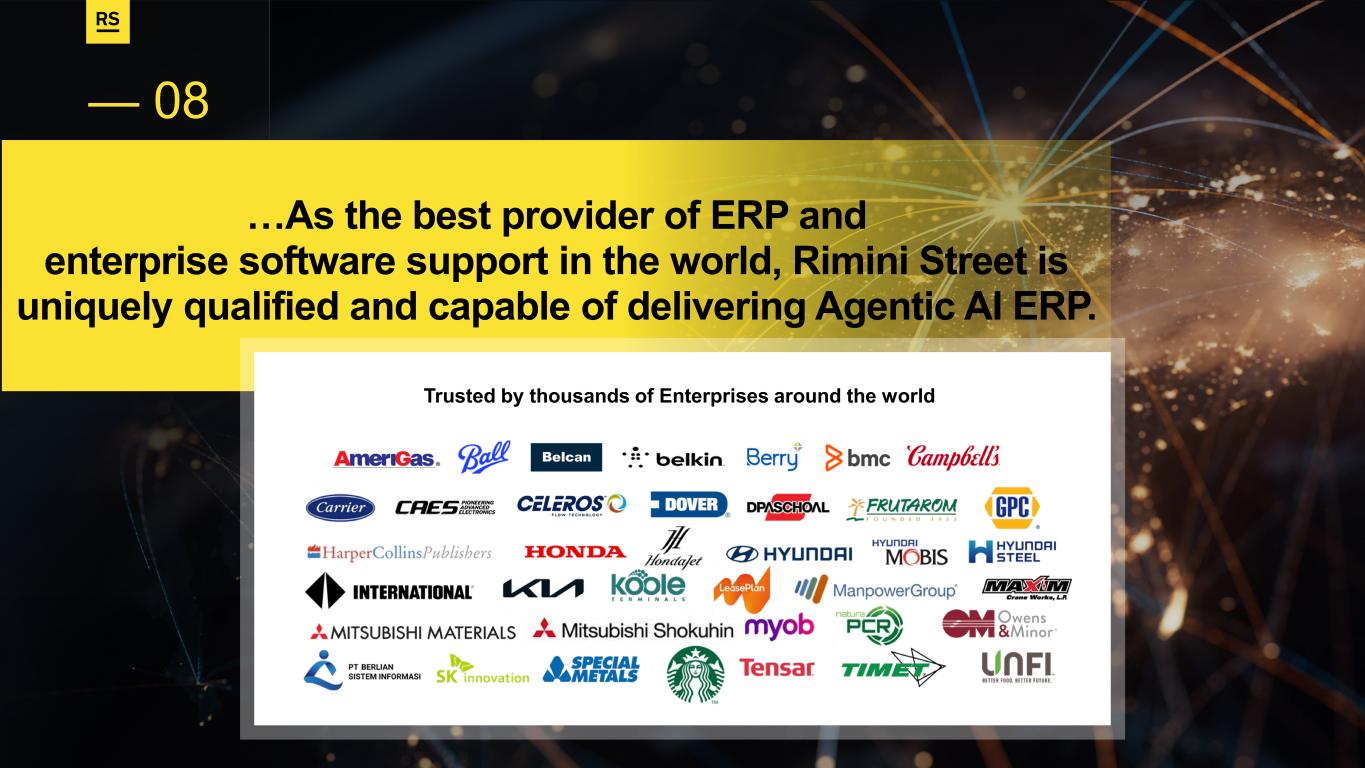 …As the best provider of ERP and enterprise software support in the world, Rimini Street is uniquely qualified and capable of delivering Agentic AI ERP. — 08 Trusted by thousands of Enterprises around the world