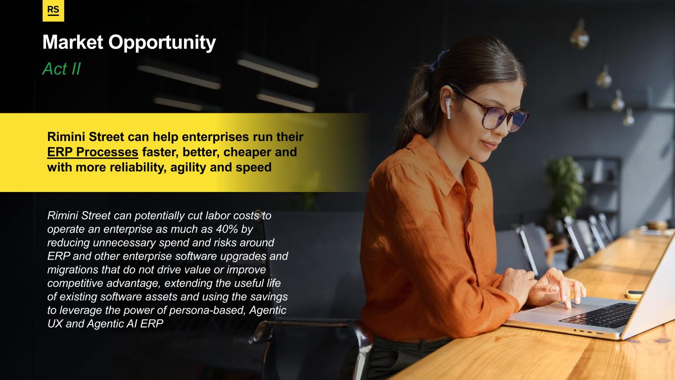 PROPERTY OF RIMINI STREET ©2025 | PROPRIETARY AND CONFIDENTIAL Act II Market Opportunity Rimini Street can help enterprises run their ERP Processes faster, better, cheaper and with more reliability, agility and speed Rimini Street can potentially cut labor costs to operate an enterprise as much as 40% by reducing unnecessary spend and risks around ERP and other enterprise software upgrades and migrations that do not drive value or improve competitive advantage, extending the useful life of existing software assets and using the savings to leverage the power of persona-based, Agentic UX and Agentic AI ERP