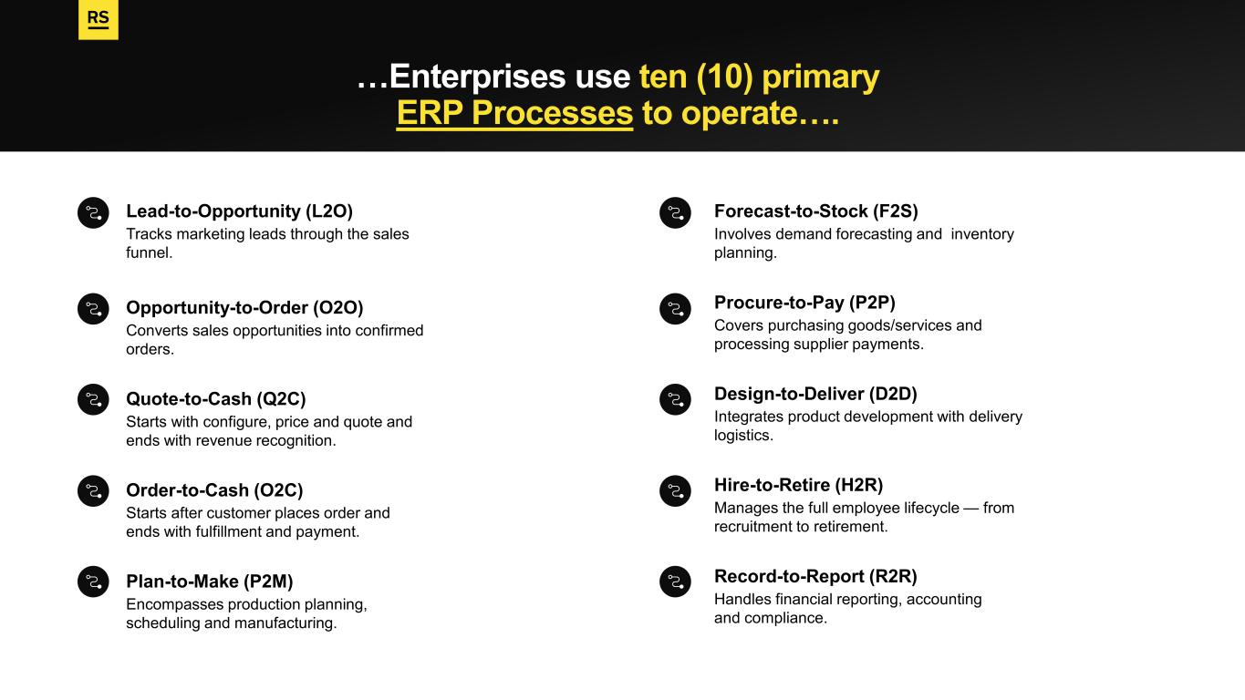 …Enterprises use ten (10) primary ERP Processes to operate…. Lead-to-Opportunity (L2O) Tracks marketing leads through the sales funnel. Opportunity-to-Order (O2O) Converts sales opportunities into confirmed orders. Quote-to-Cash (Q2C) Starts with configure, price and quote and ends with revenue recognition. Order-to-Cash (O2C) Starts after customer places order and ends with fulfillment and payment. Plan-to-Make (P2M) Encompasses production planning, scheduling and manufacturing. Forecast-to-Stock (F2S) Involves demand forecasting and inventory planning. Procure-to-Pay (P2P) Covers purchasing goods/services and processing supplier payments. Design-to-Deliver (D2D) Integrates product development with delivery logistics. Hire-to-Retire (H2R) Manages the full employee lifecycle — from recruitment to retirement. Record-to-Report (R2R) Handles financial reporting, accounting and compliance.