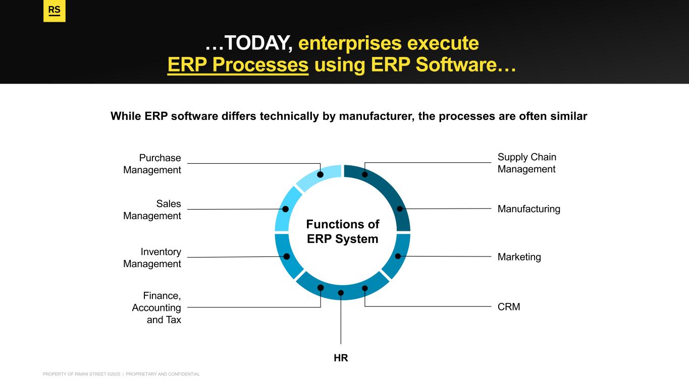PROPERTY OF RIMINI STREET ©2025 | PROPRIETARY AND CONFIDENTIAL …TODAY, enterprises execute ERP Processes using ERP Software… Functions of ERP System Purchase Management Sales Management Inventory Management Finance, Accounting and Tax HR Supply Chain Management Manufacturing Marketing CRM While ERP software differs technically by manufacturer, the processes are often similar