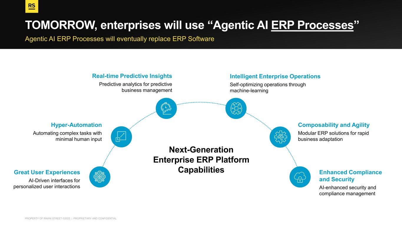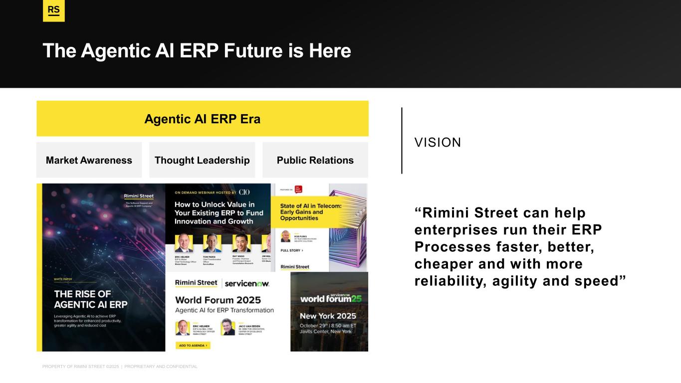PROPERTY OF RIMINI STREET ©2025 | PROPRIETARY AND CONFIDENTIAL The Agentic AI ERP Future is Here “Rimini Street can help enterprises run their ERP Processes faster, better, cheaper and with more reliability, agility and speed” Agentic AI ERP Era Thought LeadershipMarket Awareness Public Relations VISION