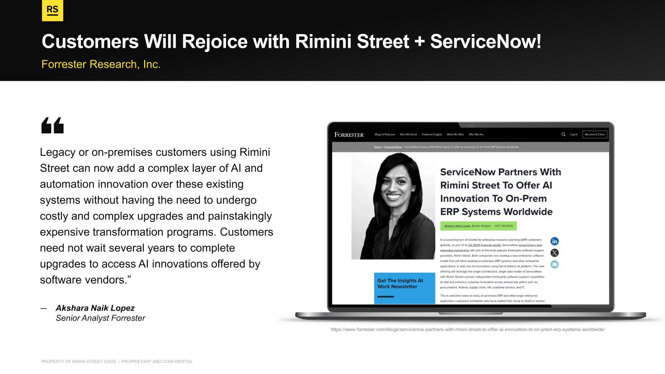 PROPERTY OF RIMINI STREET ©2025 | PROPRIETARY AND CONFIDENTIAL Forrester Research, Inc. Customers Will Rejoice with Rimini Street + ServiceNow! Legacy or on-premises customers using Rimini Street can now add a complex layer of AI and automation innovation over these existing systems without having the need to undergo costly and complex upgrades and painstakingly expensive transformation programs. Customers need not wait several years to complete upgrades to access AI innovations offered by software vendors.” — Akshara Naik Lopez Senior Analyst Forrester https://www.forrester.com/blogs/servicenow-partners-with-rimini-street-to-offer-ai-innovation-to-on-prem-erp-systems-worldwide/