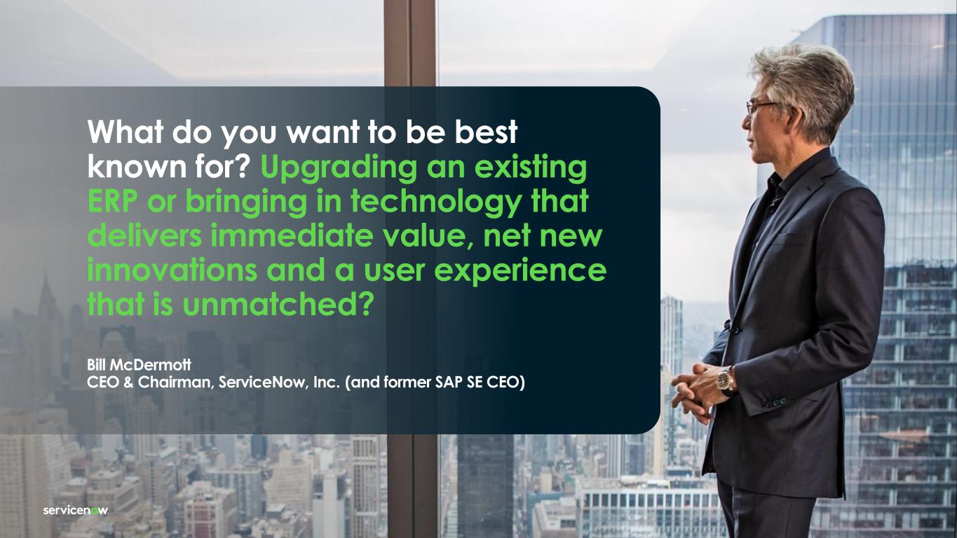 What do you want to be best known for? Upgrading an existing ERP or bringing in technology that delivers immediate value, net new innovations and a user experience that is unmatched? Bill McDermott CEO & Chairman, ServiceNow, Inc. (and former SAP SE CEO)