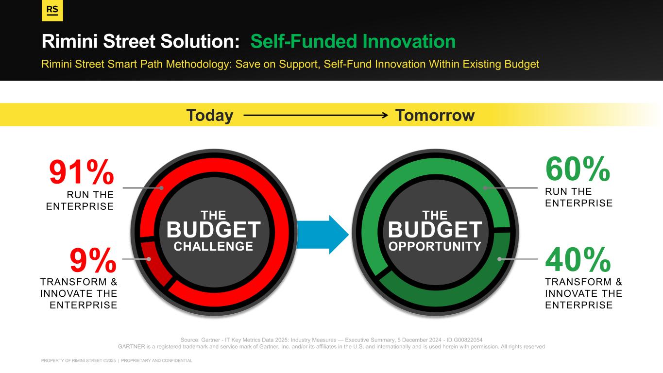 PROPERTY OF RIMINI STREET ©2025 | PROPRIETARY AND CONFIDENTIAL Rimini Street Smart Path Methodology: Save on Support, Self-Fund Innovation Within Existing Budget Rimini Street Solution: Self-Funded Innovation Tomorrow THE BUDGET OPPORTUNITY 60% RUN THE ENTERPRISE 40% TRANSFORM & INNOVATE THE ENTERPRISE THE BUDGET CHALLENGE Today 91% RUN THE ENTERPRISE 9% TRANSFORM & INNOVATE THE ENTERPRISE Source: Gartner - IT Key Metrics Data 2025: Industry Measures — Executive Summary, 5 December 2024 - ID G00822054 GARTNER is a registered trademark and service mark of Gartner, Inc. and/or its affiliates in the U.S. and internationally and is used herein with permission. All rights reserved
