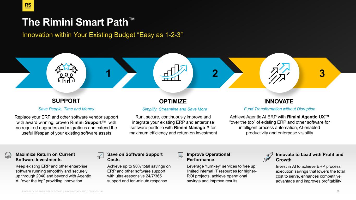 PROPERTY OF RIMINI STREET ©2025 | PROPRIETARY AND CONFIDENTIAL Innovation within Your Existing Budget “Easy as 1-2-3” The Rimini Smart Path Replace your ERP and other software vendor support with award winning, proven Rimini Support with no required upgrades and migrations and extend the useful lifespan of your existing software assets Run, secure, continuously improve and integrate your existing ERP and enterprise software portfolio with Rimini Manage for maximum efficiency and return on investment Achieve Agentic AI ERP with Rimini Agentic UX “over the top” of existing ERP and other software for intelligent process automation, AI-enabled productivity and enterprise visibility SUPPORT OPTIMIZE INNOVATE Save People, Time and Money Simplify, Streamline and Save More Fund Transformation without Disruption 1 32 Maximize Return on Current Software Investments Keep existing ERP and other enterprise software running smoothly and securely up through 2040 and beyond with Agentic AI “over the top” providing innovation Save on Software Support Costs Achieve up to 90% total savings on ERP and other software support with ultra-responsive 24/7/365 support and ten-minute response Improve Operational Performance Leverage “turnkey” services to free up limited internal IT resources for higher- ROI projects, achieve operational savings and improve results Innovate to Lead with Profit and Growth Invest in AI to achieve ERP process execution savings that lowers the total cost to serve, enhances competitive advantage and improves profitability 27