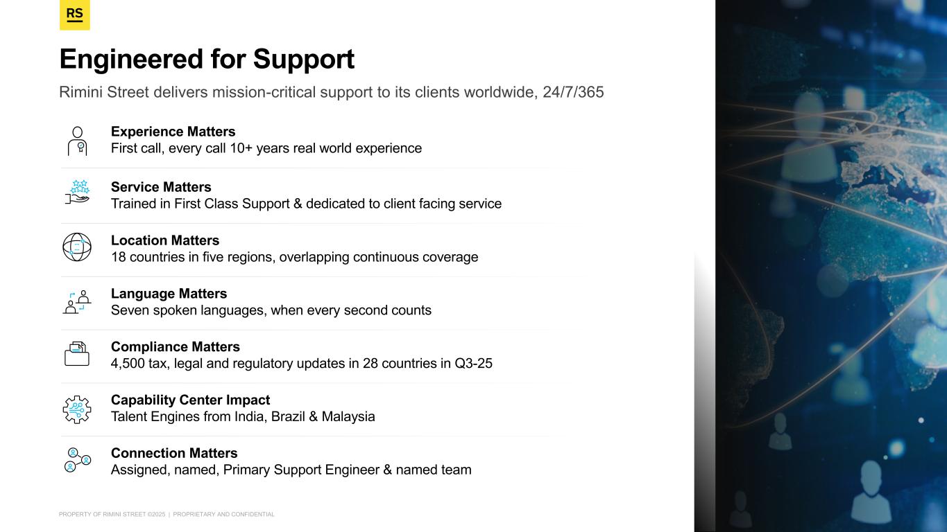 PROPERTY OF RIMINI STREET ©2025 | PROPRIETARY AND CONFIDENTIAL Rimini Street delivers mission-critical support to its clients worldwide, 24/7/365 Engineered for Support Experience Matters First call, every call 10+ years real world experience Service Matters Trained in First Class Support & dedicated to client facing service Location Matters 18 countries in five regions, overlapping continuous coverage Connection Matters Assigned, named, Primary Support Engineer & named team Capability Center Impact Talent Engines from India, Brazil & Malaysia Language Matters Seven spoken languages, when every second counts Compliance Matters 4,500 tax, legal and regulatory updates in 28 countries in Q3-25