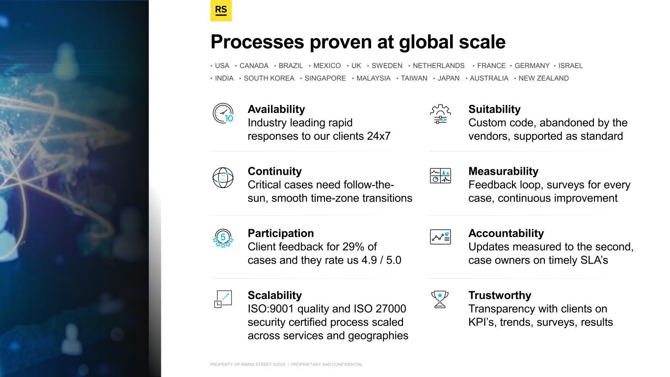 PROPERTY OF RIMINI STREET ©2025 | PROPRIETARY AND CONFIDENTIAL ‣ USA ‣ CANADA ‣ BRAZIL ‣ MEXICO ‣ UK ‣ SWEDEN ‣ NETHERLANDS ‣ FRANCE ‣ GERMANY ‣ ISRAEL ‣ INDIA ‣ SOUTH KOREA ‣ SINGAPORE ‣ MALAYSIA ‣ TAIWAN ‣ JAPAN ‣ AUSTRALIA ‣ NEW ZEALAND​ Processes proven at global scale Availability Industry leading rapid responses to our clients 24x7 Continuity Critical cases need follow-the- sun, smooth time-zone transitions Participation Client feedback for 29% of cases and they rate us 4.9 / 5.0​ Scalability ISO:9001 quality and ISO 27000 security certified process scaled across services and geographies Suitability Custom code, abandoned by the vendors, supported as standard Measurability Feedback loop, surveys for every case, continuous improvement​ Accountability Updates measured to the second, case owners on timely SLA’s​ Trustworthy Transparency with clients on KPI’s, trends, surveys, results