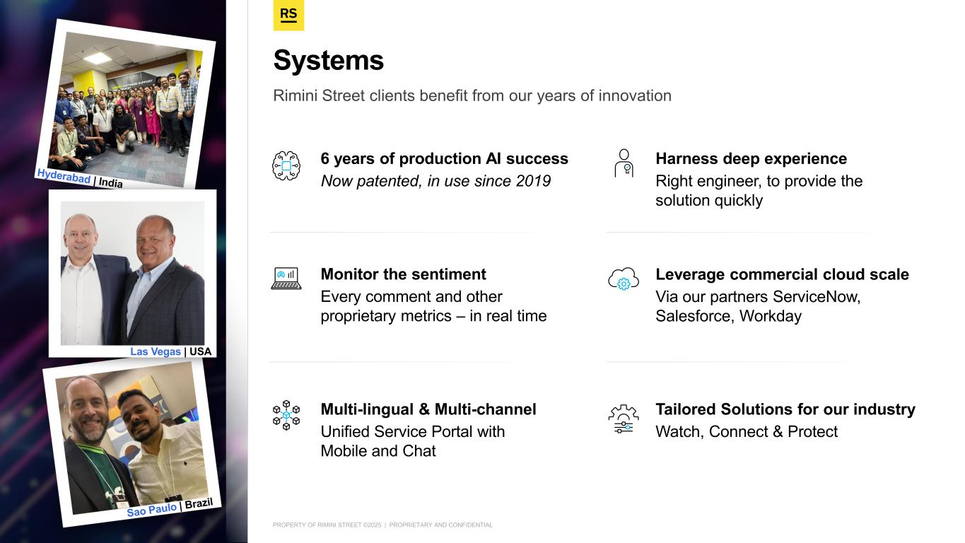 PROPERTY OF RIMINI STREET ©2025 | PROPRIETARY AND CONFIDENTIAL Rimini Street clients benefit from our years of innovation Systems 6 years of production AI success Now patented, in use since 2019 Harness deep experience Right engineer, to provide the solution quickly Monitor the sentiment Every comment and other proprietary metrics – in real time Leverage commercial cloud scale Via our partners ServiceNow, Salesforce, Workday Multi-lingual & Multi-channel Unified Service Portal with Mobile and Chat Tailored Solutions for our industry Watch, Connect & Protect Las Vegas | USA