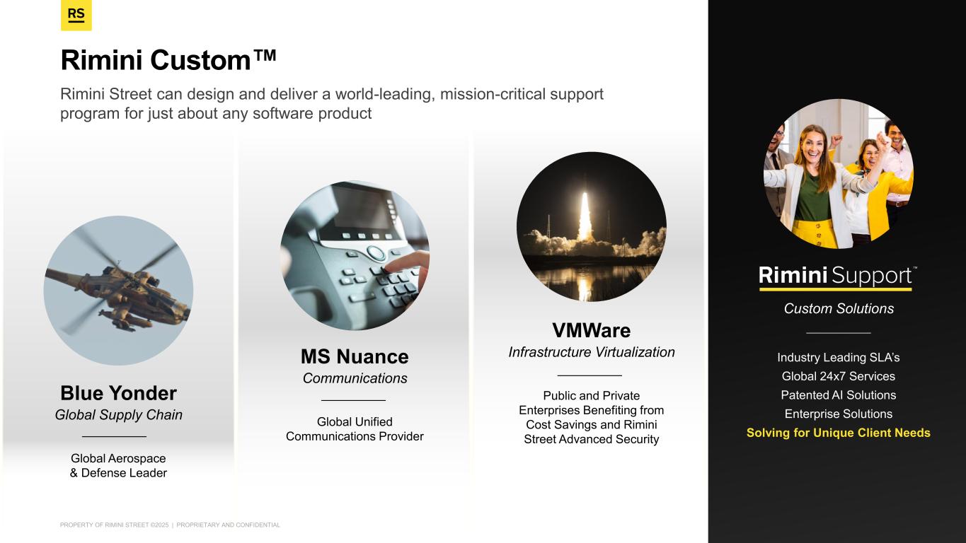 PROPERTY OF RIMINI STREET ©2025 | PROPRIETARY AND CONFIDENTIAL Rimini Street can design and deliver a world-leading, mission-critical support program for just about any software product Rimini Custom Blue Yonder Global Supply Chain Global Aerospace & Defense Leader MS Nuance Communications Global Unified Communications Provider VMWare Infrastructure Virtualization Public and Private Enterprises Benefiting from Cost Savings and Rimini Street Advanced Security Custom Solutions Industry Leading SLA’s Global 24x7 Services Patented AI Solutions Enterprise Solutions Solving for Unique Client Needs