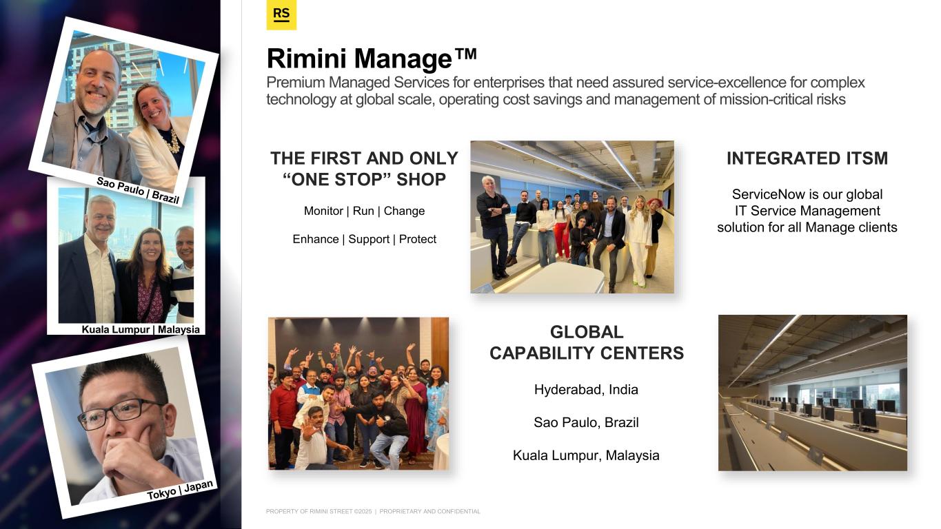 PROPERTY OF RIMINI STREET ©2025 | PROPRIETARY AND CONFIDENTIAL GLOBAL CAPABILITY CENTERS Hyderabad, India Sao Paulo, Brazil Kuala Lumpur, Malaysia INTEGRATED ITSM ServiceNow is our global IT Service Management solution for all Manage clients Monitor | Run | Change Enhance | Support | Protect THE FIRST AND ONLY “ONE STOP” SHOP Rimini Manage Premium Managed Services for enterprises that need assured service-excellence for complex technology at global scale, operating cost savings and management of mission-critical risks Kuala Lumpur | Malaysia