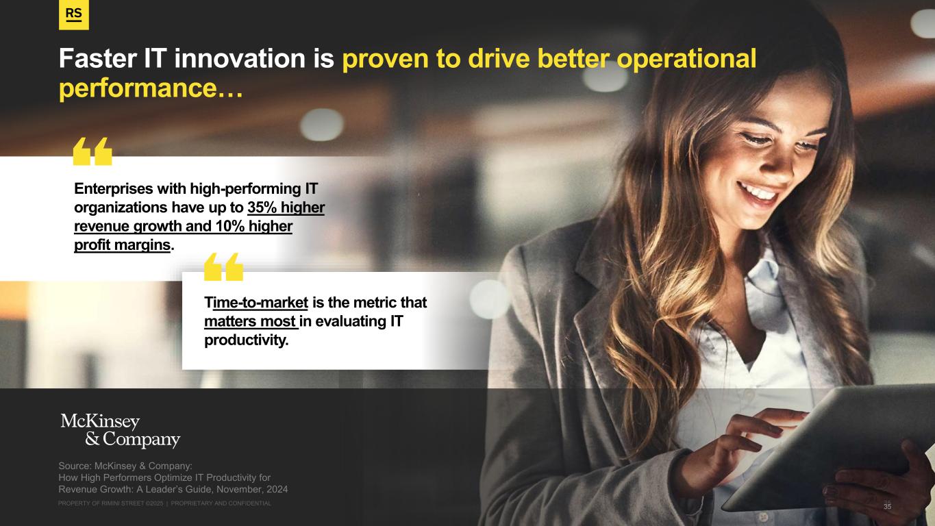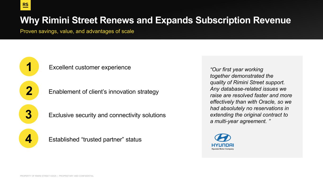 PROPERTY OF RIMINI STREET ©2025 | PROPRIETARY AND CONFIDENTIAL Proven savings, value, and advantages of scale Why Rimini Street Renews and Expands Subscription Revenue “Our first year working together demonstrated the quality of Rimini Street support. Any database-related issues we raise are resolved faster and more effectively than with Oracle, so we had absolutely no reservations in extending the original contract to a multi-year agreement. ” 1 Excellent customer experience Enablement of client’s innovation strategy 2 Exclusive security and connectivity solutions3 Established “trusted partner” status4
