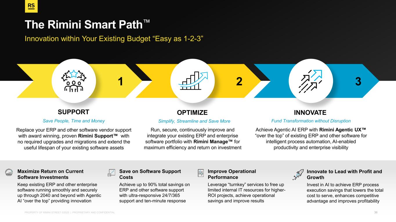 PROPERTY OF RIMINI STREET ©2025 | PROPRIETARY AND CONFIDENTIAL Innovation within Your Existing Budget “Easy as 1-2-3” The Rimini Smart Path Replace your ERP and other software vendor support with award winning, proven Rimini Support with no required upgrades and migrations and extend the useful lifespan of your existing software assets Run, secure, continuously improve and integrate your existing ERP and enterprise software portfolio with Rimini Manage for maximum efficiency and return on investment Achieve Agentic AI ERP with Rimini Agentic UX “over the top” of existing ERP and other software for intelligent process automation, AI-enabled productivity and enterprise visibility SUPPORT OPTIMIZE INNOVATE Save People, Time and Money Simplify, Streamline and Save More Fund Transformation without Disruption 1 32 Maximize Return on Current Software Investments Keep existing ERP and other enterprise software running smoothly and securely up through 2040 and beyond with Agentic AI “over the top” providing innovation Save on Software Support Costs Achieve up to 90% total savings on ERP and other software support with ultra-responsive 24/7/365 support and ten-minute response Improve Operational Performance Leverage “turnkey” services to free up limited internal IT resources for higher- ROI projects, achieve operational savings and improve results Innovate to Lead with Profit and Growth Invest in AI to achieve ERP process execution savings that lowers the total cost to serve, enhances competitive advantage and improves profitability 36
