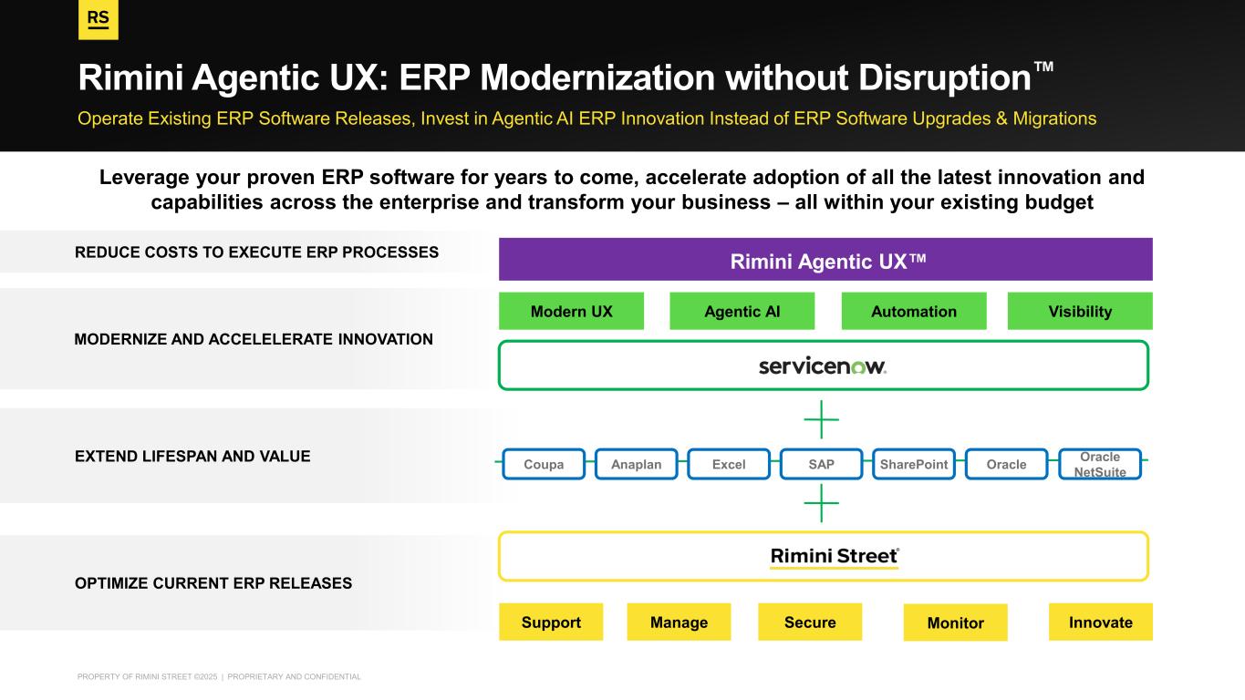 PROPERTY OF RIMINI STREET ©2025 | PROPRIETARY AND CONFIDENTIAL Operate Existing ERP Software Releases, Invest in Agentic AI ERP Innovation Instead of ERP Software Upgrades & Migrations Rimini Agentic UX: ERP Modernization without Disruption OPTIMIZE CURRENT ERP RELEASES EXTEND LIFESPAN AND VALUE MODERNIZE AND ACCELELERATE INNOVATION Leverage your proven ERP software for years to come, accelerate adoption of all the latest innovation and capabilities across the enterprise and transform your business – all within your existing budget Modern UX Agentic AI Automation Visibility Support Manage Secure InnovateMonitor Coupa Anaplan Excel SAP SharePoint Oracle Oracle NetSuite Rimini Agentic UX REDUCE COSTS TO EXECUTE ERP PROCESSES