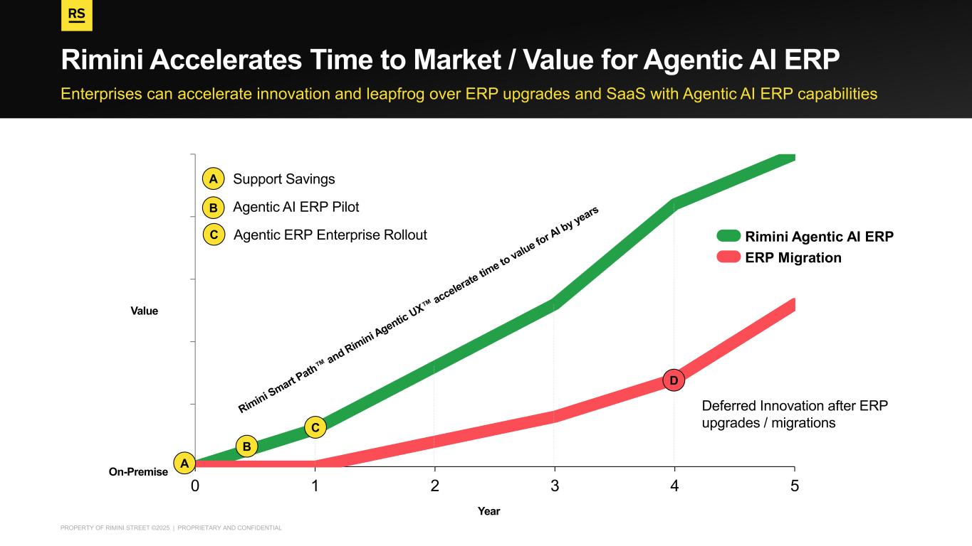 PROPERTY OF RIMINI STREET ©2025 | PROPRIETARY AND CONFIDENTIAL 0 1 2 3 4 5 Year Value Enterprises can accelerate innovation and leapfrog over ERP upgrades and SaaS with Agentic AI ERP capabilities Rimini Accelerates Time to Market / Value for Agentic AI ERP Rimini Agentic AI ERP ERP Migration C B A C B A Support Savings Agentic AI ERP Pilot Agentic ERP Enterprise Rollout D Deferred Innovation after ERP upgrades / migrations On-Premise