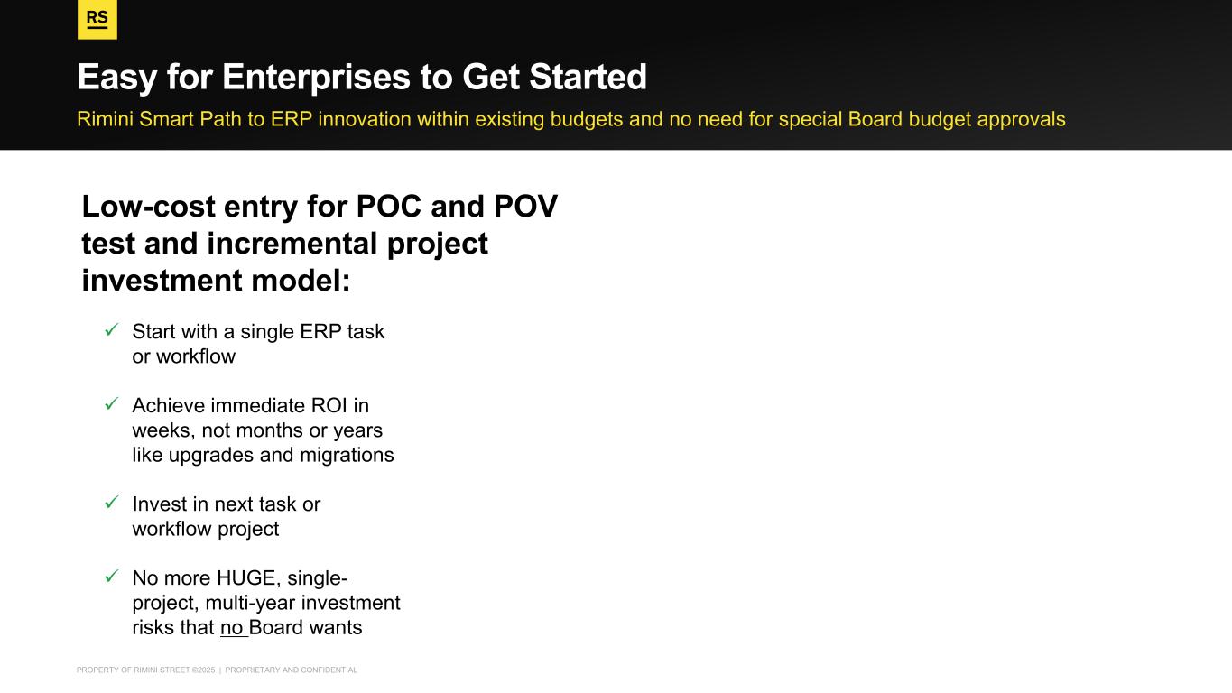 PROPERTY OF RIMINI STREET ©2025 | PROPRIETARY AND CONFIDENTIAL Rimini Smart Path to ERP innovation within existing budgets and no need for special Board budget approvals Easy for Enterprises to Get Started Year ✓ Start with a single ERP task or workflow ✓ Achieve immediate ROI in weeks, not months or years like upgrades and migrations ✓ Invest in next task or workflow project ✓ No more HUGE, single- project, multi-year investment risks that no Board wants Low-cost entry for POC and POV test and incremental project investment model: