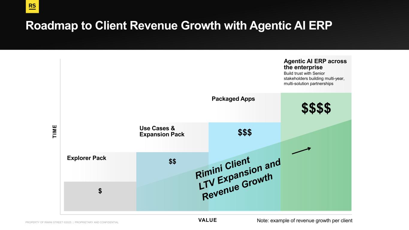 PROPERTY OF RIMINI STREET ©2025 | PROPRIETARY AND CONFIDENTIAL Roadmap to Client Revenue Growth with Agentic AI ERP Explorer Pack Use Cases & Expansion Pack $$ Packaged Apps $$$ Agentic AI ERP across the enterprise Build trust with Senior stakeholders building multi-year, multi-solution partnerships​ $$$$ T IM E VALUE $ Note: example of revenue growth per client