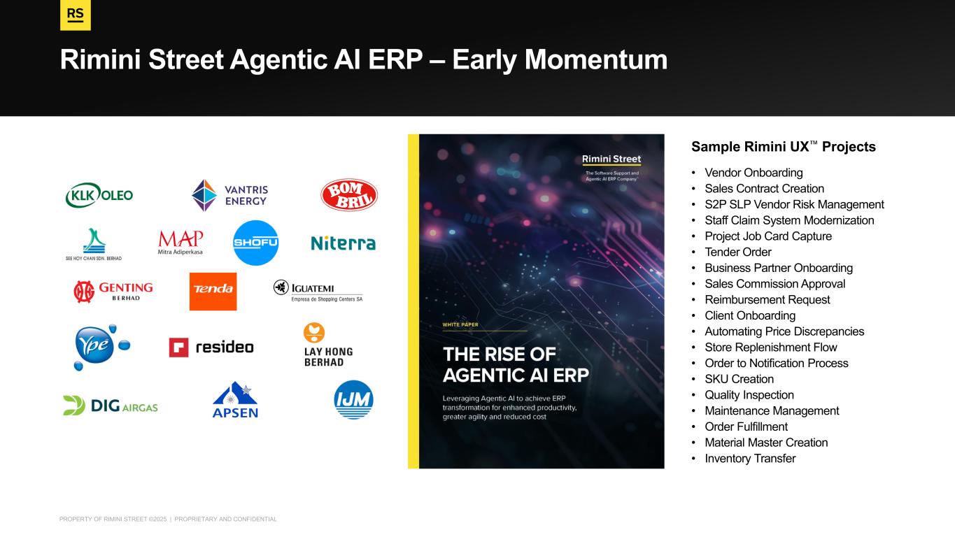 PROPERTY OF RIMINI STREET ©2025 | PROPRIETARY AND CONFIDENTIAL Key differentiators and market conditions uniquely position Rimini Street as leader in Agentic AI ERP Rimini Street Owns Agentic AI ERP AI is a leapfrog strategy AI gives customers the ability to leapfrog over traditional disruptive SaaS ERP migrations Real life experience with Pilots Global Pilots in 2025, provide the learning and foundation for deployment at scale Large addressable market Several premise ERP, SCM, and CRM customers are at crossroads on low-value, high-risk ERP migrations and upgrades Time to value Agentic AI on ERP systems in a matter of weeks vs. months and years Rimini Street knows ERP processes Domain experience in SAP, Oracle and other ERP Software Total cost of ownership Rimini Smart Path is the only option that self- funds real savings for innovation and AI Strong support experience Rimini Street’s experience providing L4 Support to large number of ERP systems Vendor agnostic Rimini’s domain experience and Agentic UX solution is vendor agnostic allowing us to move to customer first platforms