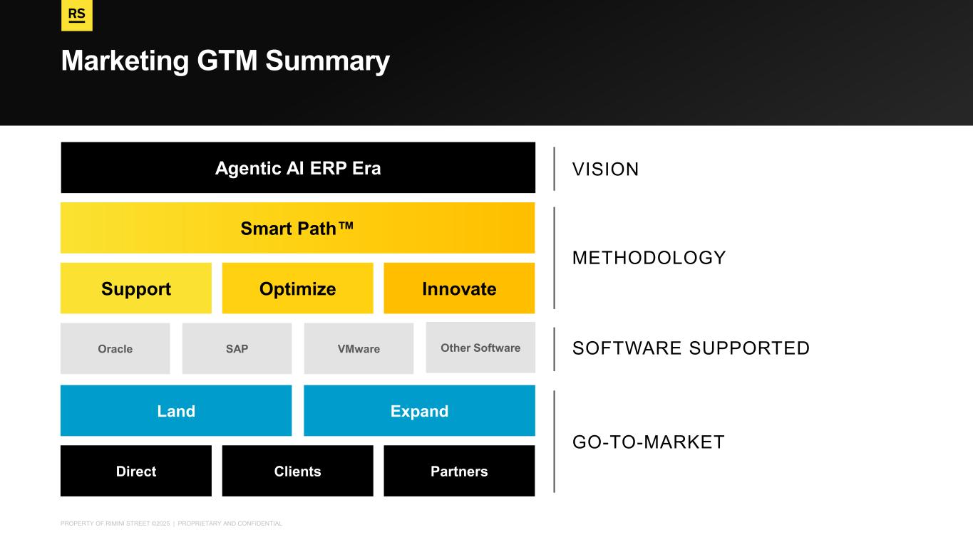 PROPERTY OF RIMINI STREET ©2025 | PROPRIETARY AND CONFIDENTIAL Marketing GTM Summary Oracle Agentic AI ERP Era Smart Path OptimizeSupport Innovate SAP VMware Other Software Land Expand ClientsDirect Partners VISION METHODOLOGY SOFTWARE SUPPORTED GO-TO-MARKET