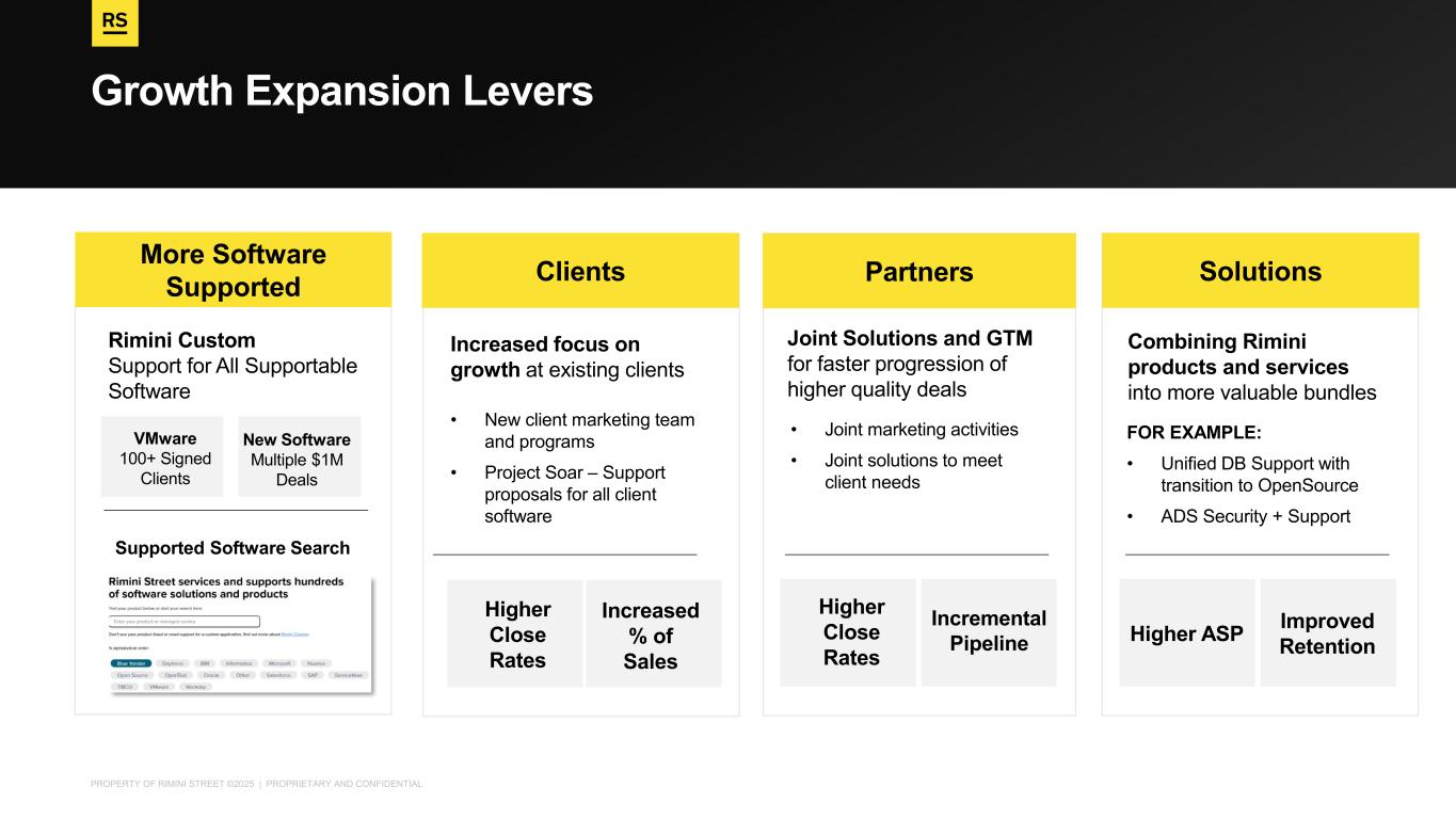 PROPERTY OF RIMINI STREET ©2025 | PROPRIETARY AND CONFIDENTIAL Growth Expansion Levers More Software Supported Rimini Custom Support for All Supportable Software VMware 100+ Signed Clients Supported Software Search New Software Multiple $1M Deals Clients Increased focus on growth at existing clients • New client marketing team and programs • Project Soar – Support proposals for all client software Higher Close Rates Increased % of Sales Partners • Joint marketing activities • Joint solutions to meet client needs Joint Solutions and GTM for faster progression of higher quality deals Incremental Pipeline Solutions Combining Rimini products and services into more valuable bundles Higher ASP Improved Retention FOR EXAMPLE: • Unified DB Support with transition to OpenSource • ADS Security + Support Higher Close Rates