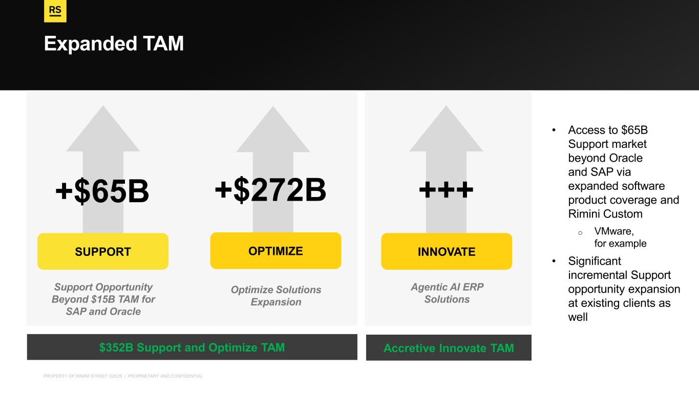 PROPERTY OF RIMINI STREET ©2025 | PROPRIETARY AND CONFIDENTIAL Expanded TAM Support Opportunity Beyond $15B TAM for SAP and Oracle Optimize Solutions Expansion Agentic AI ERP Solutions $352B Support and Optimize TAM Accretive Innovate TAM • Access to $65B Support market beyond Oracle and SAP via expanded software product coverage and Rimini Custom o VMware, for example • Significant incremental Support opportunity expansion at existing clients as well +$65B +$272B +++ SUPPORT OPTIMIZE INNOVATE