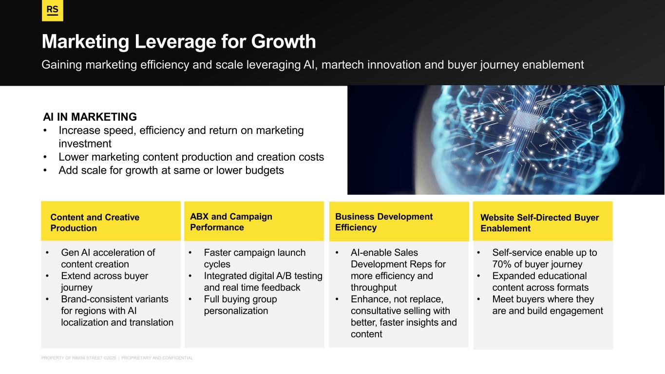 PROPERTY OF RIMINI STREET ©2025 | PROPRIETARY AND CONFIDENTIAL Gaining marketing efficiency and scale leveraging AI, martech innovation and buyer journey enablement Marketing Leverage for Growth AI IN MARKETING • Increase speed, efficiency and return on marketing investment • Lower marketing content production and creation costs • Add scale for growth at same or lower budgets • Gen AI acceleration of content creation • Extend across buyer journey • Brand-consistent variants for regions with AI localization and translation • Self-service enable up to 70% of buyer journey • Expanded educational content across formats • Meet buyers where they are and build engagement Website Self-Directed Buyer Enablement • AI-enable Sales Development Reps for more efficiency and throughput • Enhance, not replace, consultative selling with better, faster insights and content • Faster campaign launch cycles • Integrated digital A/B testing and real time feedback • Full buying group personalization Content and Creative Production Business Development Efficiency ABX and Campaign Performance