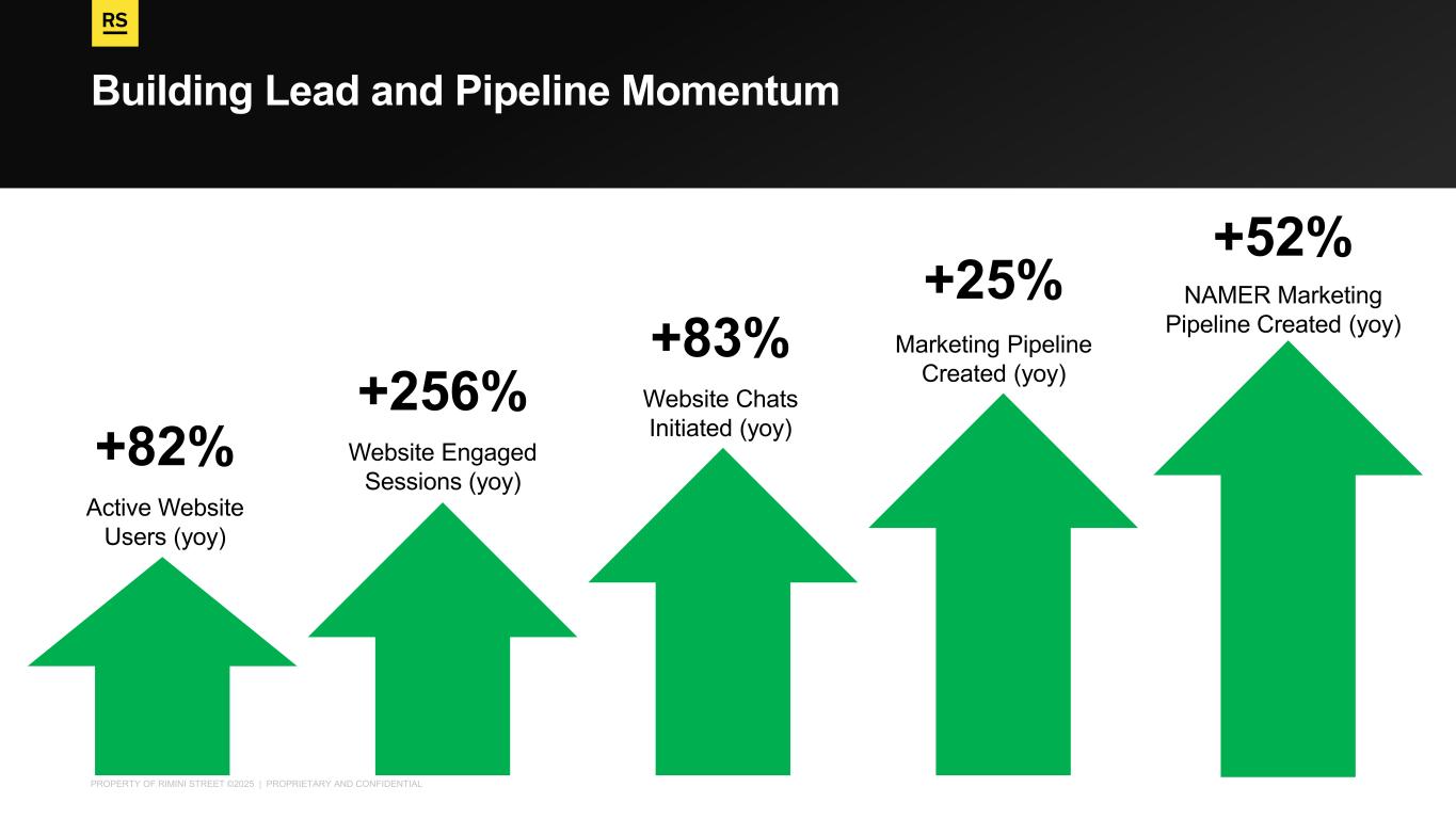 PROPERTY OF RIMINI STREET ©2025 | PROPRIETARY AND CONFIDENTIAL Building Lead and Pipeline Momentum +82% Active Website Users (yoy) +52% NAMER Marketing Pipeline Created (yoy) +256% Website Engaged Sessions (yoy) +83% Website Chats Initiated (yoy) +25% Marketing Pipeline Created (yoy)