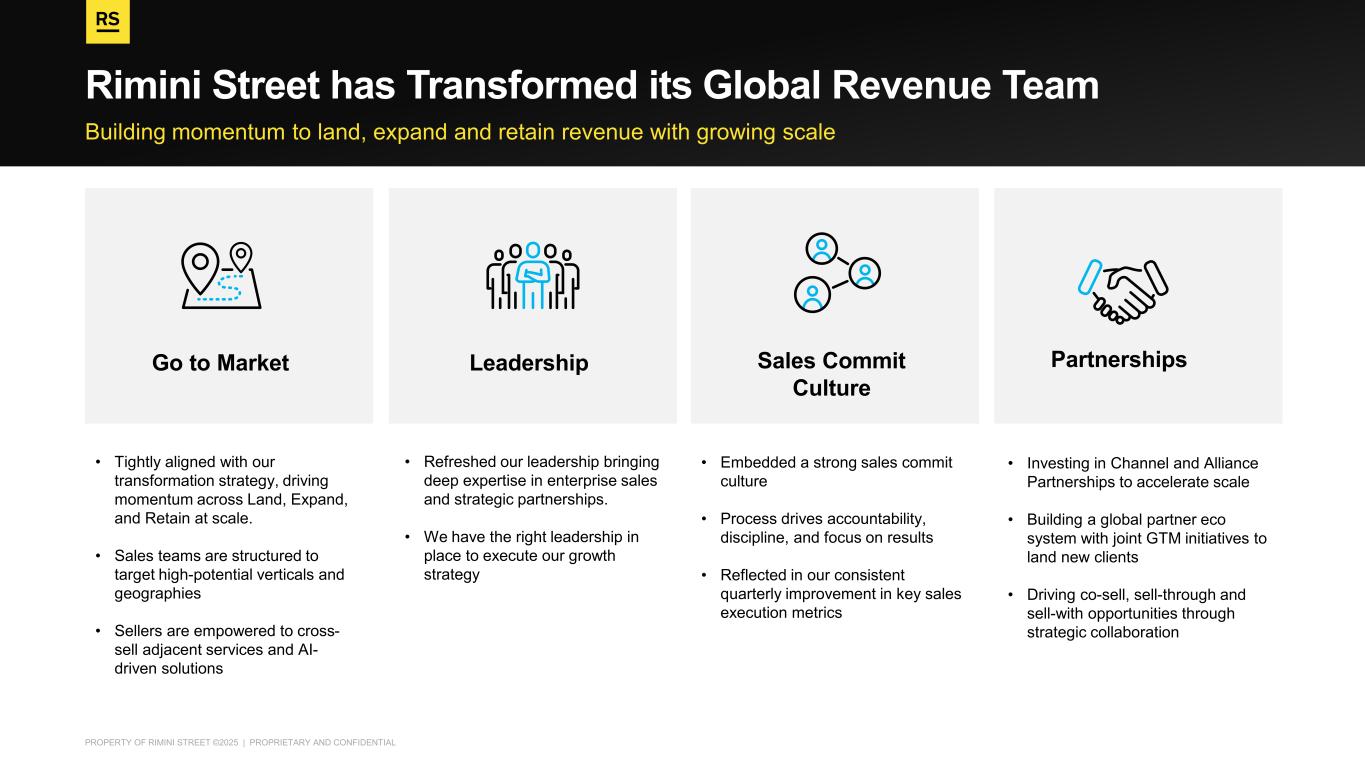 PROPERTY OF RIMINI STREET ©2025 | PROPRIETARY AND CONFIDENTIAL Building momentum to land, expand and retain revenue with growing scale Rimini Street has Transformed its Global Revenue Team Leadership Go to Market Partnerships Sales Commit Culture • Tightly aligned with our transformation strategy, driving momentum across Land, Expand, and Retain at scale. • Sales teams are structured to target high-potential verticals and geographies • Sellers are empowered to cross- sell adjacent services and AI- driven solutions • Refreshed our leadership bringing deep expertise in enterprise sales and strategic partnerships. • We have the right leadership in place to execute our growth strategy • Embedded a strong sales commit culture • Process drives accountability, discipline, and focus on results • Reflected in our consistent quarterly improvement in key sales execution metrics • Investing in Channel and Alliance Partnerships to accelerate scale • Building a global partner eco system with joint GTM initiatives to land new clients • Driving co-sell, sell-through and sell-with opportunities through strategic collaboration
