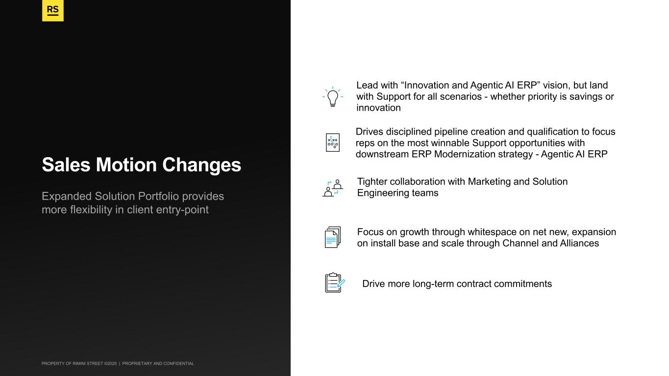 PROPERTY OF RIMINI STREET ©2025 | PROPRIETARY AND CONFIDENTIAL Expanded Solution Portfolio provides more flexibility in client entry-point Sales Motion Changes Lead with “Innovation and Agentic AI ERP” vision, but land with Support for all scenarios - whether priority is savings or innovation Drives disciplined pipeline creation and qualification to focus reps on the most winnable Support opportunities with downstream ERP Modernization strategy - Agentic AI ERP Tighter collaboration with Marketing and Solution Engineering teams Focus on growth through whitespace on net new, expansion on install base and scale through Channel and Alliances Drive more long-term contract commitments